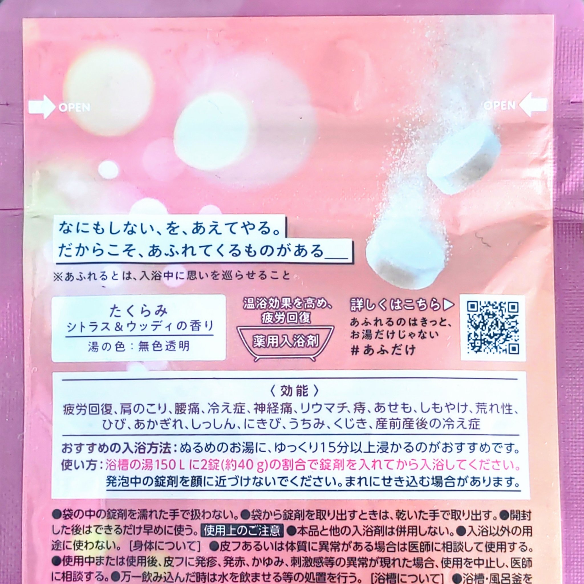 疲れた心も体も癒されたいなら☁️/LIPSショッピングで見つけた、パケがエモい入浴剤をご紹介!────────────⚫︎バブあふれるのはきっと、お湯だけじゃないたくらみシトラス&ウッディの香り6錠入¥990(税込)POINT/▼リラックスモードになれる香り優しく香るシトラスとウッディの香りは、甘さが控えめで心に沁みる〜✨ふんわり包み込んでくれるような香りが私はハマってしまった🌱▼無色透明タイプこれを使う前は着色されていたり、泡タイプの入浴剤が好みだったのですが、ちょっと考え方が変わった!!お風呂が映えるような入浴剤は特別な日に、この無色透明の入浴剤は日々の疲れを癒したい時に使いたくなる✨一見すると同じ入浴剤ですが、用途に合わせて使い分けたいですね🫧▼3回分で¥990日常的に使いやすいお手頃価格なのに、香りはお値段以上だと感じました!1個¥1,000のバスボムは特別な気分になれるけど、金銭的に毎週は使えない…そんな節約中の人にもオススメしたい、プチ贅沢な日常に💗────────────無色透明タイプは物足りないと感じる人もいるかもしれませんが、大人世代の癒しを求めている人にはピッタリだと思います✨LIPSショッピングで購入できるので、日常のちょい足し贅沢にぜひ!!!#バブ#入浴剤#インバス#プチプラ