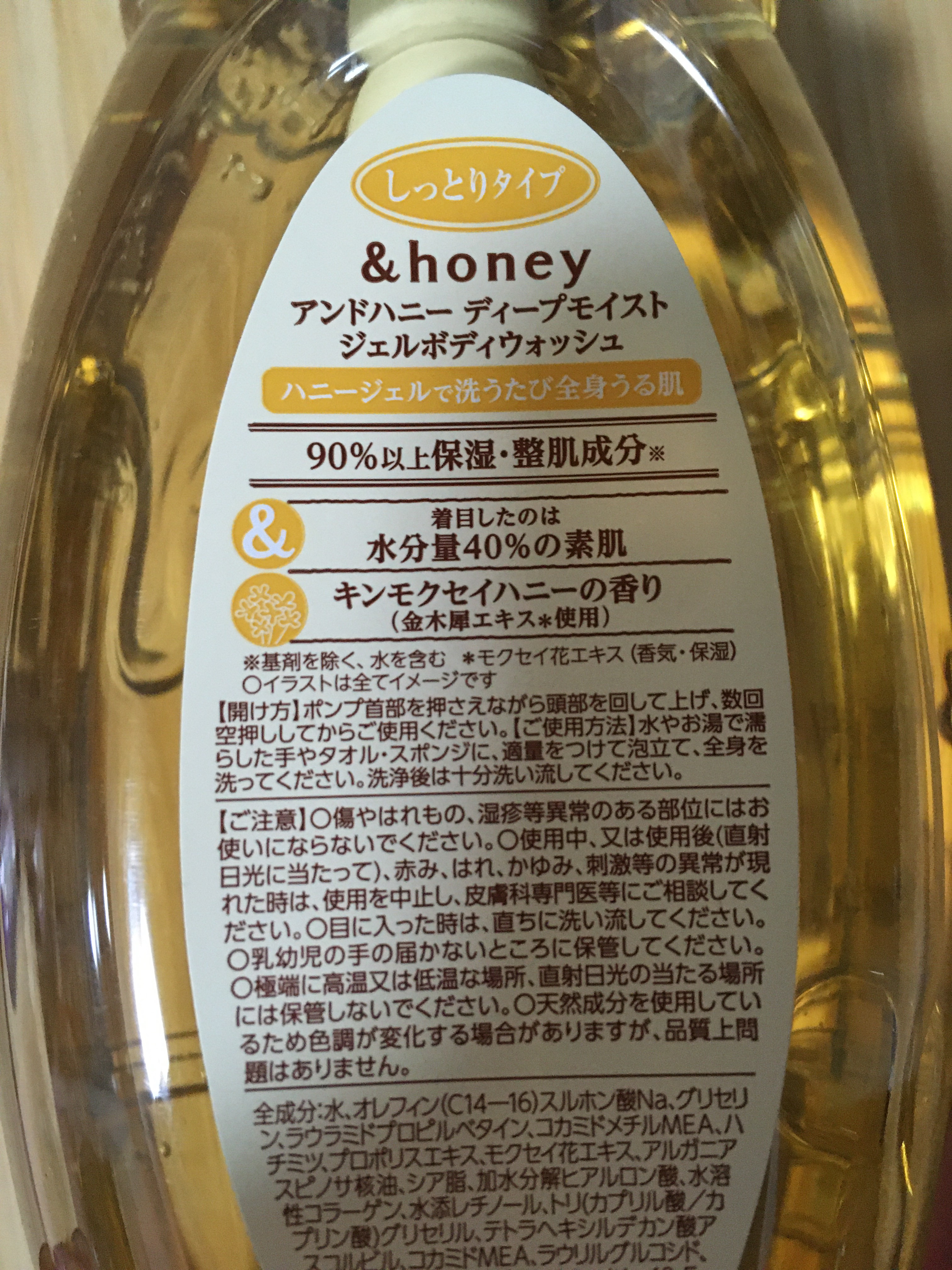 &honeyディープモイストジェルボディウォッシュ容器がはちみつの容器みたいなデザインでとってもかわいいです。金木犀の香りが結構強いので苦手な人は苦手かもしれません。泡立ちはとっても良くて、リピートしようか悩んでいます。