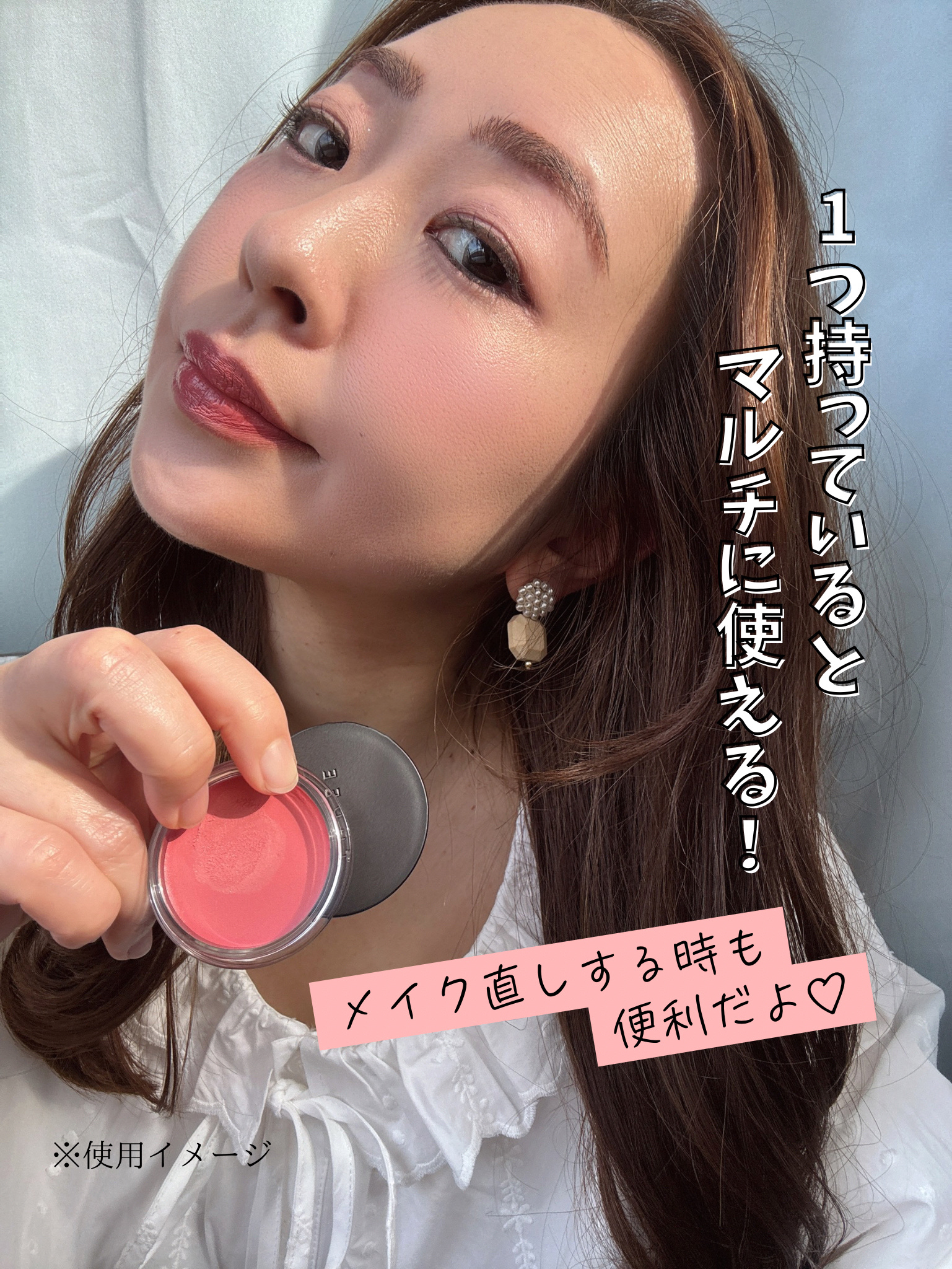 実際使ってみると想像以上にマルチだった...! 肌に伸ばすとパウダリーに変化するから濃さの調節も簡単なの😊 グラデーションも楽勝だよ✨ チークとして欲しかったのだけど、アイカラーとして最高すぎ😭 色素薄い系メイクにめちゃめちゃいい❤️ もちろんチークとしてが大本命。 ほわって仕上がる絶妙な色と質感がたまんないっ...! リップとしては少し白め。 縦じわが目立ちやすいから、赤系の発色弱めグロスと合わせるのがよかった♡