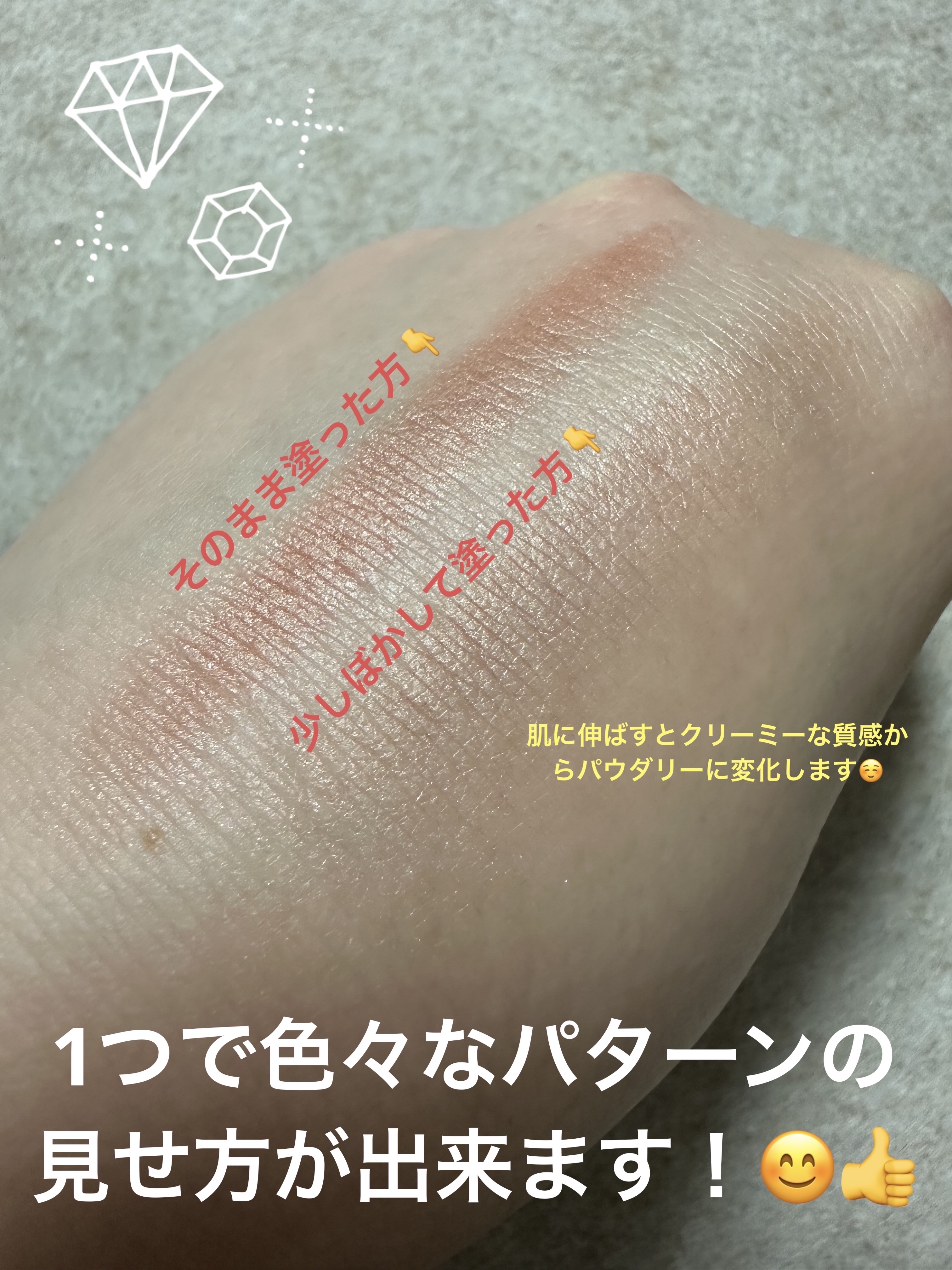 私はチークとアイシャドウとして 色を合わせて使っていますが 伸ばして少し時間を置くと 嫌なベタベタ感も無くなり ヨレもそこまで気にならずに使えたので とっても気に入っています! 朝使って、夕方ごろには二重幅に少したまったりしていますが 指でサッとボカせば元に戻るし アイシャドウのお直しも持ち歩かずに済むなと思いました! 何度か重ねたら濃さも調節できて ぼかし具合でグラデーションっぽくもなるので 本当に使えるマルチバームです!