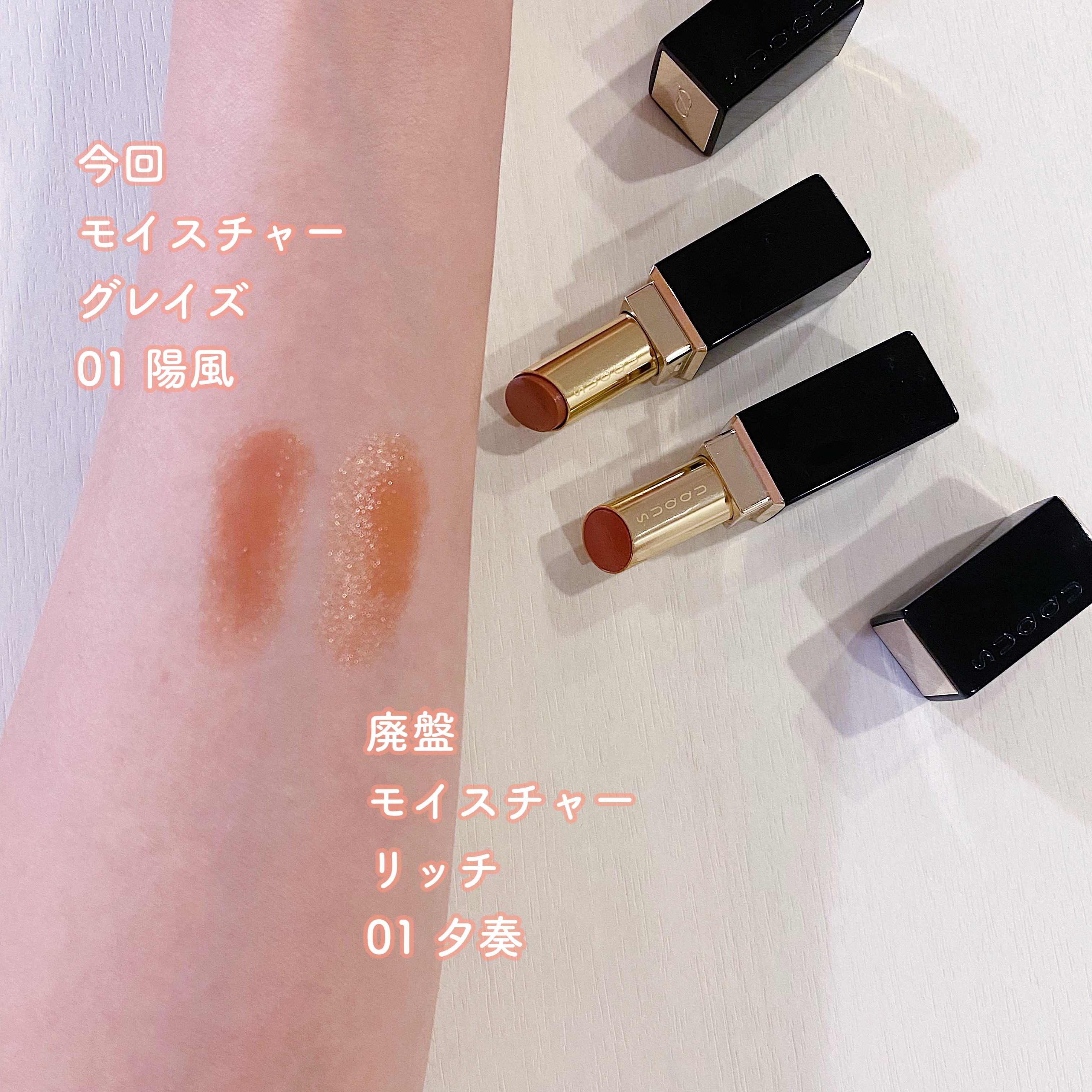 01陽風 春メイクにぴったりのシナモンベージュ✨ 優しい色味+しっかりオシャレ感が出て最高です。ムラなくスルスル塗れるので、毎日持ち歩いています! パケが可愛いと気分が上がりますね🙏🏻優勝! 02淡羽色 本当に期待以上でスック様に大感謝です🙏🏻 文句なしに可愛いキャラメルベージュのリップで、ピンクに転ぶことなく理想的なカラーでした🙏🏻 テクスチャーはこってりですが、全くストレスを感じない質感です。塗ったあとは、唇のゴワつきが消え去って縦ジワ皆無なのでほんとにすごい😭💕