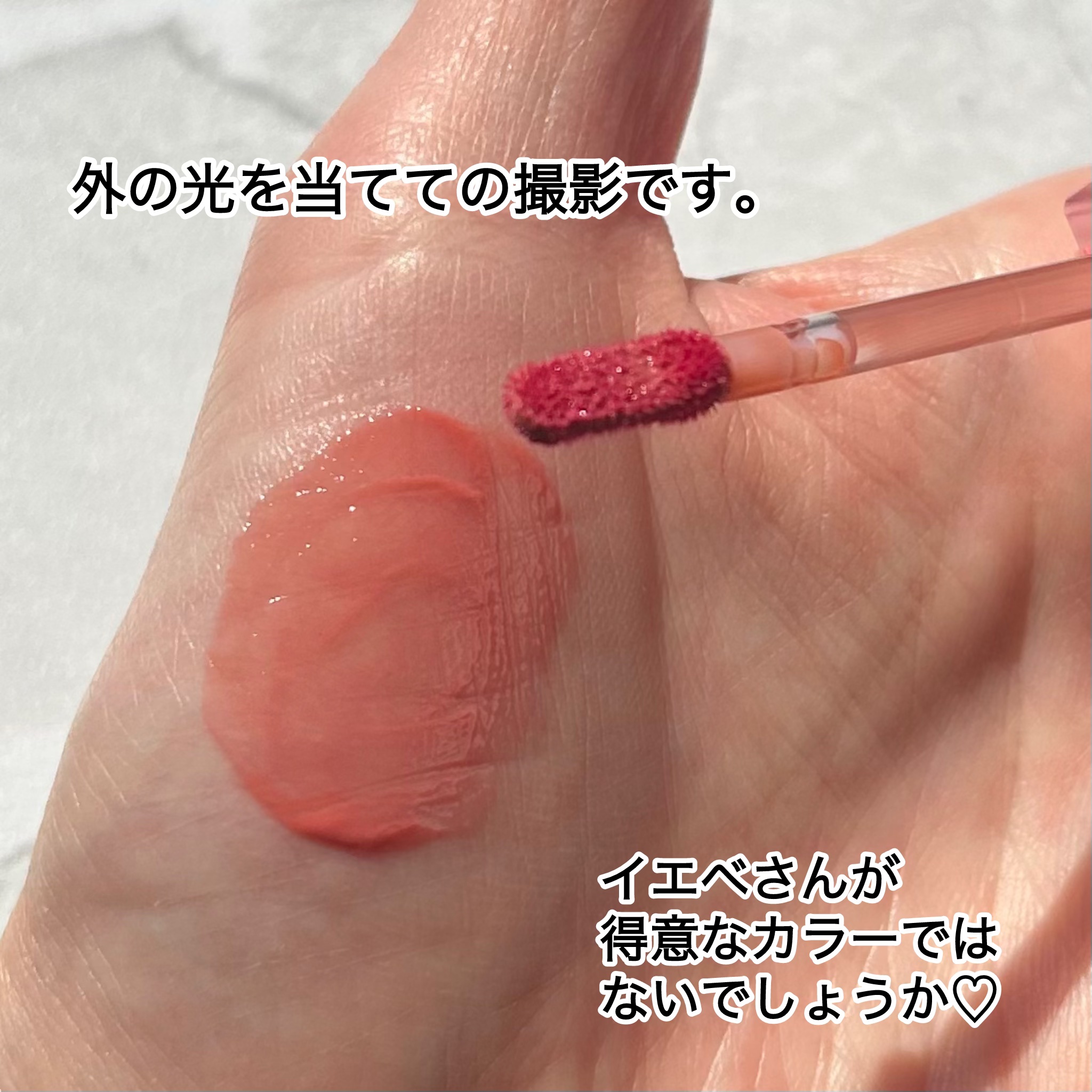 【質感】プルプルなテクスチャで塗るとむっちりする! 【良いところ】可愛いだけでなくさわやかな色なので、オフィスメイクや、スクールメイクにも良い!! この商品はパッケージも可愛いし、リップの色味も最高なのでぜひ試してみてください!