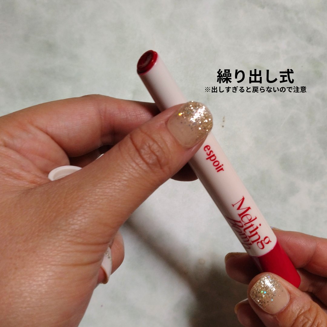 ■キラキラ光るガラス光沢!エスポア新商品メガメルティングボム■espoir メガメルティングボム ホッティートッティQoo10メガ割の購入品のちゅるんリップです✨色んなブランドさんからちゅるんリップが発売されていますが、ツヤ感が絶妙だと感じたエスポアさんをセレクト!一見、色味が強いのかな?と見えるのですが、重ねるほど色が濃厚になっていく仕様になっているので、一度塗りではナチュラルに、複数度塗りで存在感のあるカラーになっていきます💕高屈折率成分55%以上含有されたメルティングバームテクスチャーが塗る瞬間溶け込み、ガラスのような光沢感を生み出します✨保湿成分アボカドオイル配合で、べたつくことなくしっとりした塗り心地です🥑アラフォーにちゅるんリップは大丈夫かな?と思っていたのですが、実際に塗ってみると、程よい血色とツヤツヤの質感で、やりすぎない若々しい唇になったと感じました!周りの方にもよく褒められたので、このリップは1軍リップに決定🩷このホッティートッティというカラーは、メガメルティングボムの中でイエベさんにもブルベさんにもおすすめなピンク味のあるレッドカラーで、色味を悩んでる方に、まずはおすすめの1本です💄繰り出し式で、1度だすと戻らないので長く出さないように注意が必要😱保湿成分配合のちゅるんリップが気になる方や、ちゅるんリップ初心者さんにおすすめの1本です😊