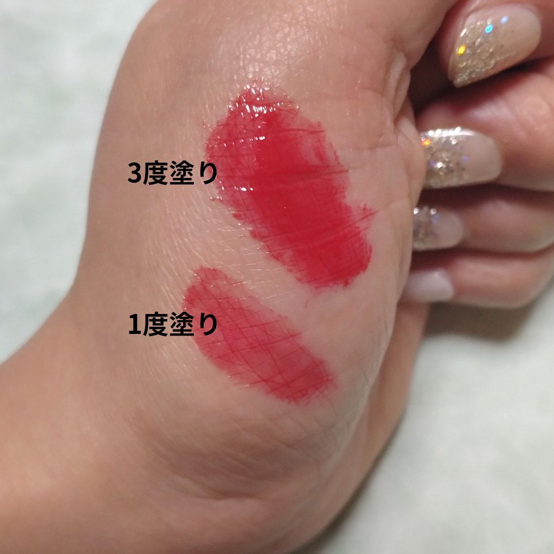 きらびやかでぷるぷるした輝きの高屈折率成分55%以上含まれているらしく、塗った瞬間唇がぷるぷるに見えてとても可愛いです。 発色はいいのに透明感もあるので、どんなシチュエーションでも活用できます。 また、アボガドオイルが使用されているので、保湿も抜群です。唇の荒れもなくべたべたしないのにしっかり保湿もしてくれるのでとっても使いやすいです。 カラーもアジア人に馴染みやすくとっても可愛いです。