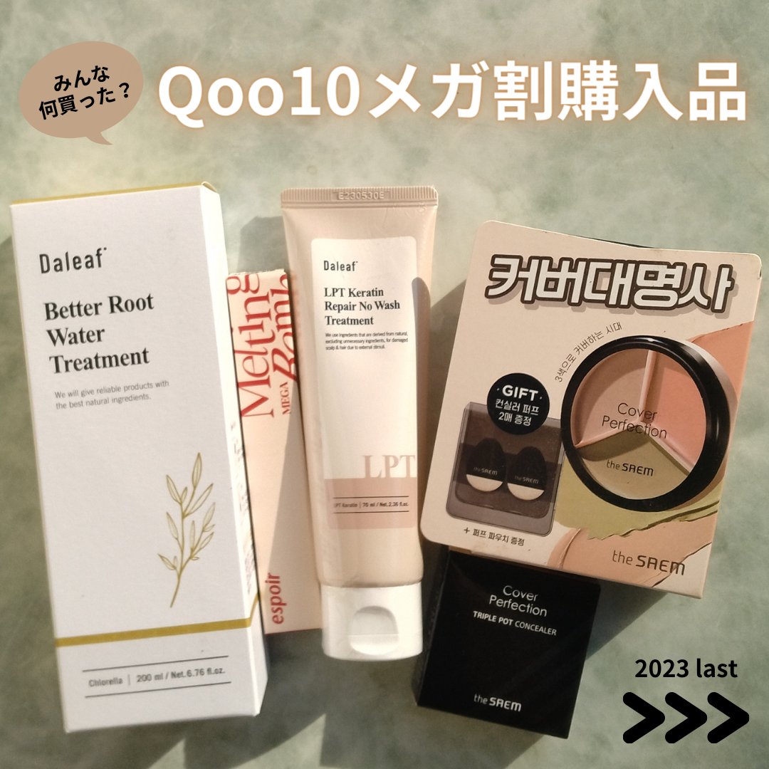 ■2023年ラスト!Qoo10メガ割購入品■Daleaf ベタールートウォータートリートメントDaleaf LPTケラチンリペアノーウォッシュトリートメントespoir メガメルティングボム ホッティートッティtheSAEM カバーパーフェクショントリプルポッドコンシーラー コレクトベージュ コントゥアベージュ2023年ラストのQoo10メガ割購入品です!他のショッピングサイトのセールでも購入したので、今回はこの4アイテムのみ😃リピートは、DaleafさんのLPTケラチンリペアノーウォッシュトリートメントのみ。こちらは夏にはじめて購入して、手放せないマストアイテムです✨乾燥が気になる今の季節にもおすすめ!髪のケアができるのはもちろん、パール配合でツヤ髪を演出💛思わず触りたくなる髪とはこのこと…😲✨初購入アイテムは、信頼しまくってるDaleafさんとespoirさんとtheSAEMさんからセレクト!こちらのアイテム達も近い内にレビューしたいと思います😊皆さんはどんなアイテムを購入しましたか?投稿を見るのを楽しみにしています😙💕#qoo10メガ割購入品