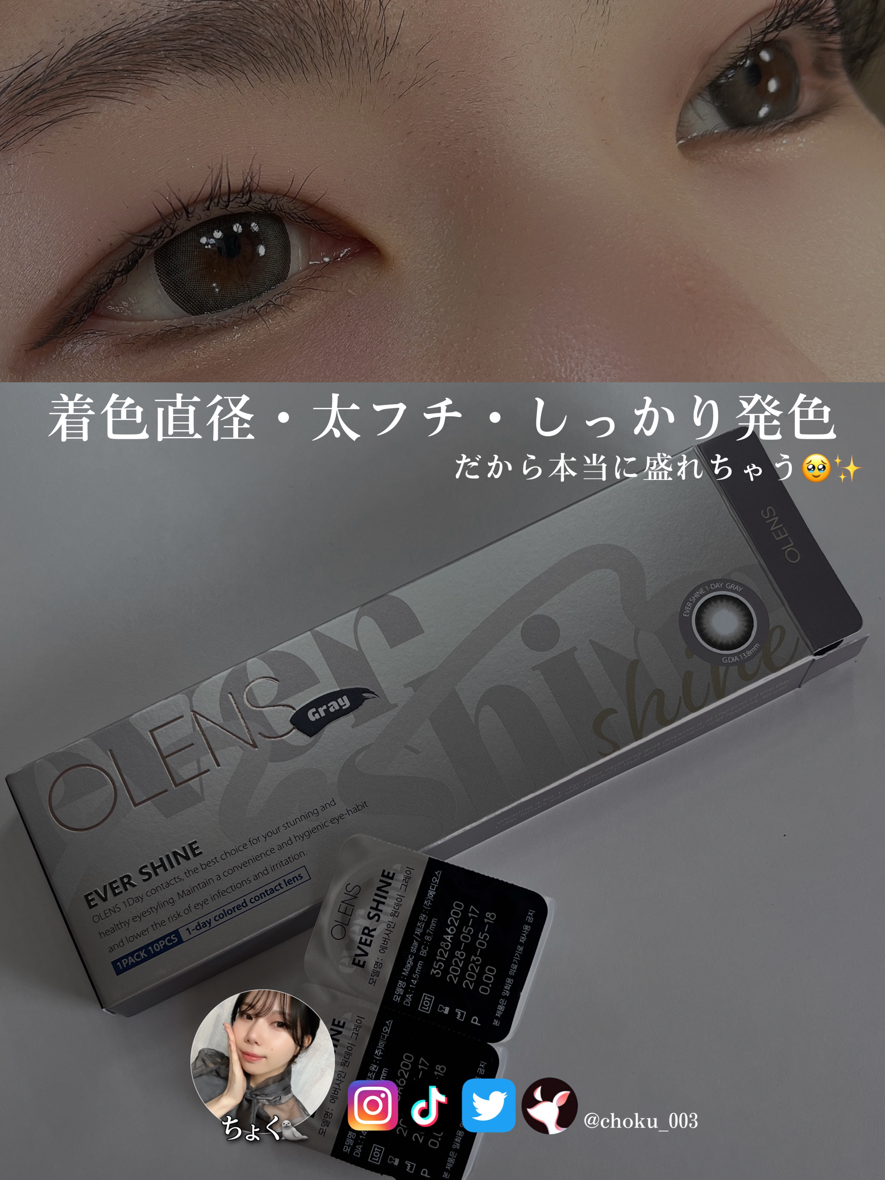 黒とグレーの良いとこ取り♡/太フチ鬼盛れグレーカラコン発見しちゃった!!※茶目の私によるレビューです🙇♀️────────────●OLENSエバーシャインワンデーグレー1箱10枚入り基本スペックは画像2枚目をご覧ください⤴️POINT/▼着色直径13.8mmナチュラル派さんも本気で盛りたい派さんも満足できそうな、ちょうど良い大きさ🙆♀️宇宙人にはなりたくないけど、少し大きめのカラコンにも挑戦したいなぁと考えてる方にオススメしたい!▼ガッツリ太フチに見えて…写真だとかなりゴツい太フチに見えますが、着けてみると思ったより馴染む✨(ナチュラルではないし、カラコンバレします⚠️)ただ、ハーフカラコンほどの派手さはないので、平ら顔の私でも余裕で使えます💪❤️🔥▼ニュートラルなグレー発色グレーと言うとブルベ向けなのかな?と思いますが、無彩色で馴染みやすいグレーだと感じました!私の茶目でも浮かなかったので、普段グレーカラコンが浮いちゃう人でも着けやすいカラーだと思います🩶・ ・ ・注意点としてはちょっと大きめだから、小粒目さんや一重さんが着けると、重く見えちゃう気がします💦────────────流行りの韓国カラコンっぽくはない気もしますが、個人的にはかなりお気に入り🥹👏茶目でも馴染みやすいグレーカラコンをお探しの方はぜひ買ってみて!!!#olens#韓国カラコン#グレーカラコン#ブルベメイク#盛れるカラコン#盛れるアイメイク#カラコン_ブルベ#カラコン1day#奥二重メイク#ブルベ映えコスメ