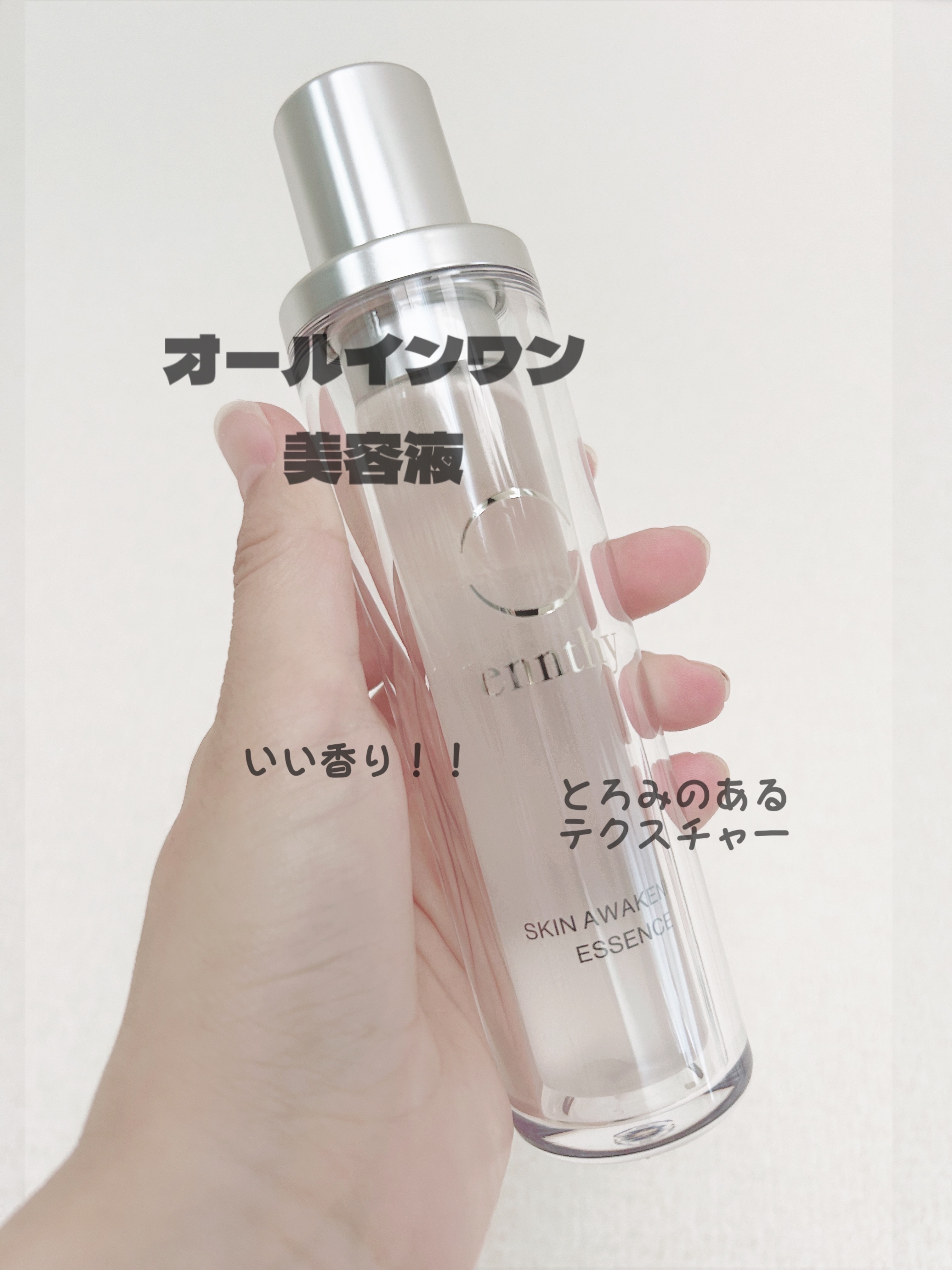 ✨ennthy スキンアウェイクニングエッセンス✨美容液とオイルを振って混ぜて使うタイプのオールインワン美容液🙌❤️いい香りで保湿の時間が癒しになります🎵とろっとしたテクスチャーでオールインワンとして使っても乾燥せずいい感じ🙆♀️でもべたつきはないので使いやすい☺️私は一度に5滴くらいを使っています‼️思っていたより量が少なくてすぐに使い終わってしまいました💦朝晩使うとニキビが少しできたので夜だけの使用に変えました🌙オイリー肌の人は気をつけてください🙆♀️