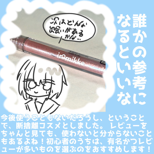 断捨離コスメ!わたしが「いらないかな」と思ったコスメです!イロミッケグリッターリキッドアイシャドウ03・ピンクロゼスパークルです!メイク始めたての時に、ドンキホーテで安さと色に誘われ、買いました。めちゃくちゃメイク練習時につかいました…笑ただ...