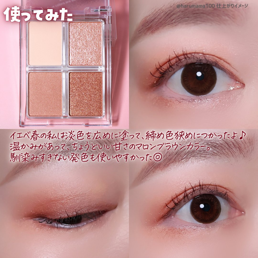 カラバリいろいろのプチプラブランド「iromikke」の4色アイシャドウパレ♪ 自分に似合う色が合わせてたくさん買って少しずつ使ってるところ♡ 今回は「04 シュルクマロン」をつかったよ。シンプルな色組み合わせのセットで、グラデを楽しめる配色になってるよ。 温かみのあるちょうどいいブラウンカラーで、イエベの私は淡色を広めに塗るのが使いやすかった◎