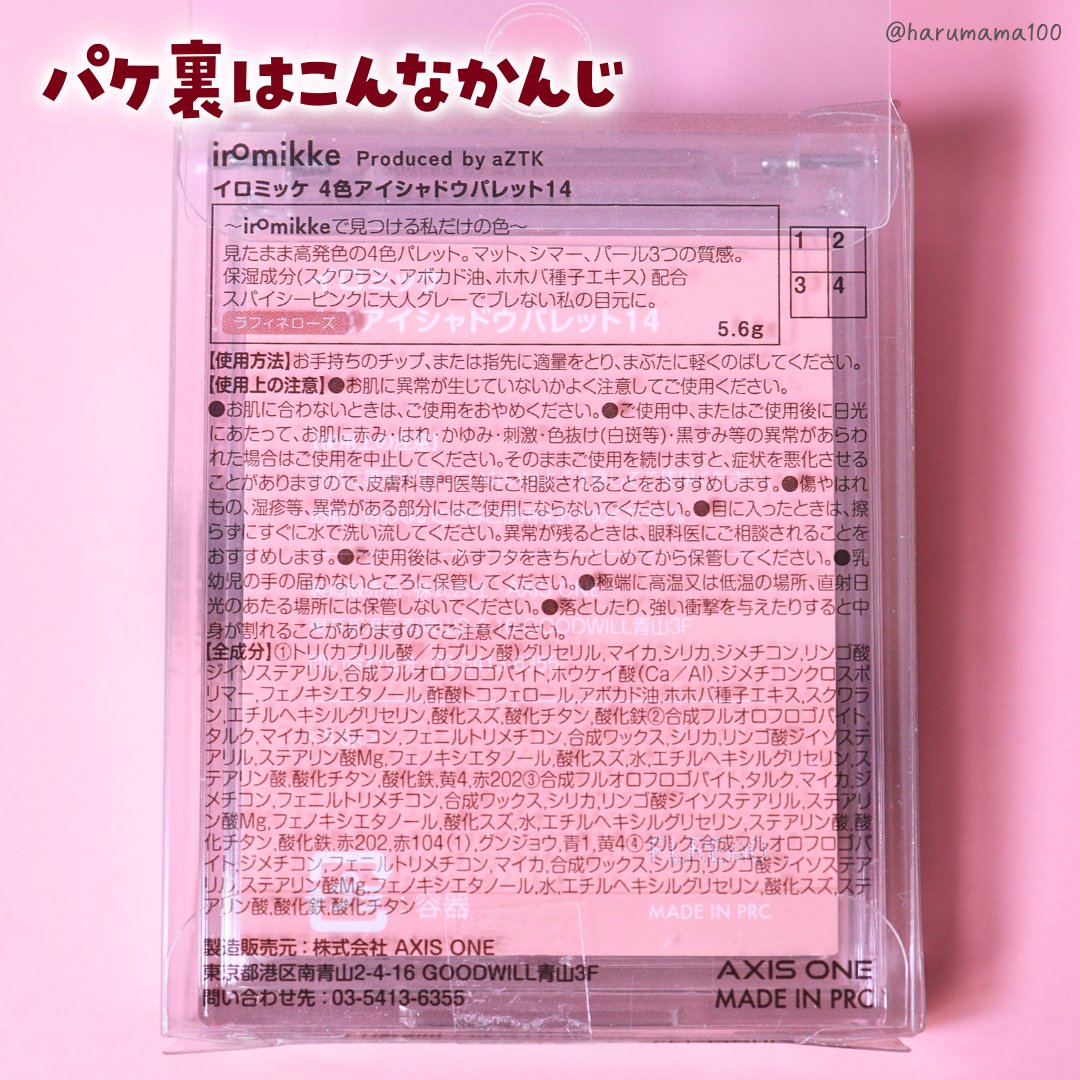 【甘辛スパイシーピンク♡プチプラアイパレ】iromikkeイロミッケ4色アイシャドウパレット14ラフィネローズ550円(税込)好きなカラーがきっと見つかる!色遊びを楽しめるプチプラコスメブランド「iromikke(イロミッケ)」の4色アイシャ...