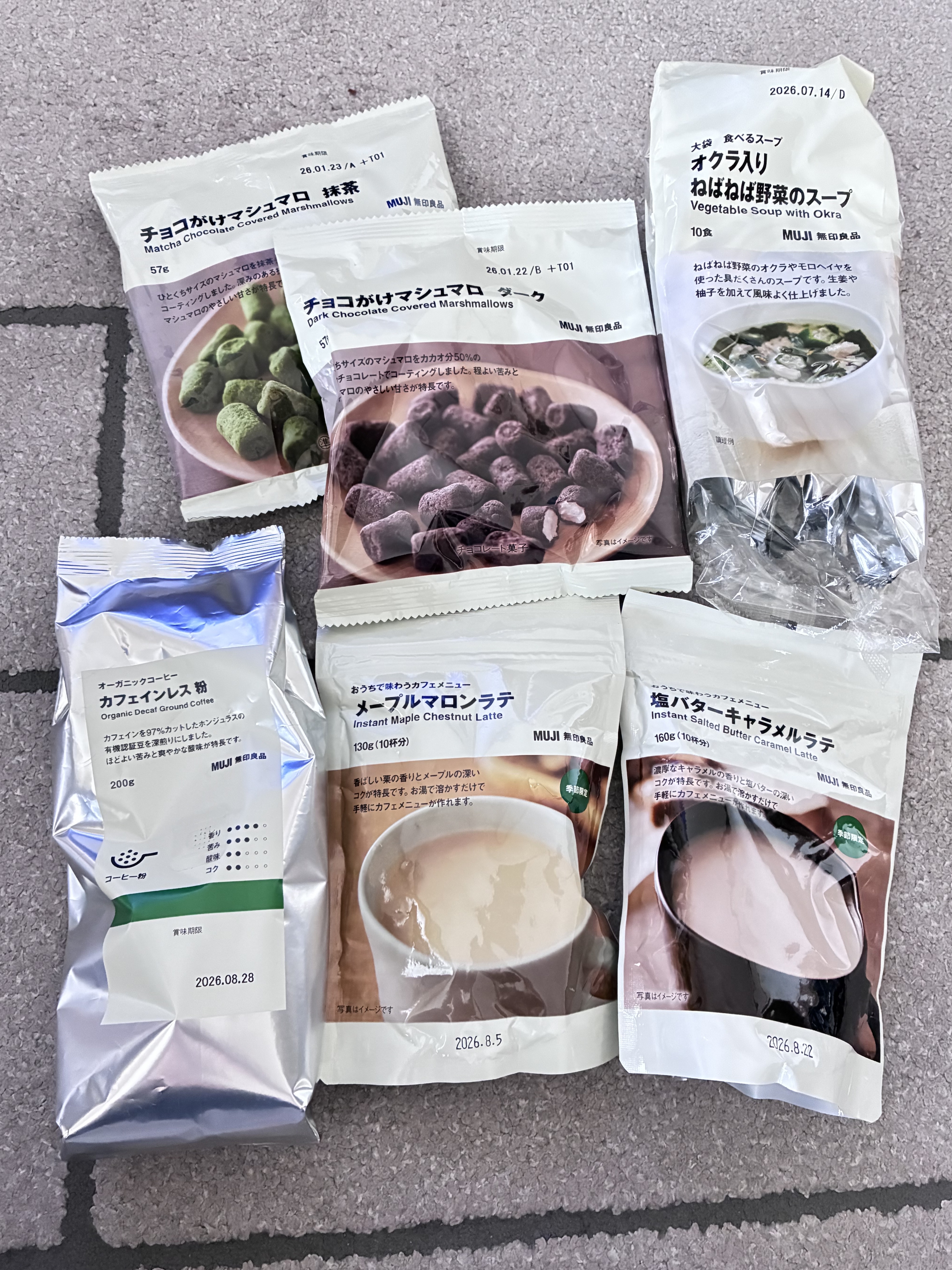 無印良品週間行ってきました!今回はストック品を中心に買う予定だったので、おすすめ品の情報を入れずに参戦したんですが、自分的にヒットなグッズが多くまるで宝探しのように楽しくお買い物できました!⭐️スキンケア品初めて使うものばかり!エイジングエア化粧品はとろみがあり乾燥期に活躍しそう!日中はUV乳液はたっぷり200グラムなので春まで使えそう!⭐️ストック品歯みがきタブレットと薬用デオドラントボディーソープはいつものお気に入り!詳しくは過去の投稿見てね!⭐️日用品ドラストやスパーより安く買えるノンアルコールウェットティシューとお白湯の美味しい季節が来るので保温保冷蓋付きマグカップ⭐️みんながまとめ買いされてたチョコかけマシュマロ!ココアに浮かべると美味しいらしい!あとは期間限定のメープルマロンラテと塩バターキャラメルラテといつものオーガニックコーヒーのカフェインレス粉とオクラ入りねばねば野菜のスープ!以上合計12677円が無印良品週間10パーセント割引➕ポイント引きで1,1342円楽しかったからあともう一回いこうかな!