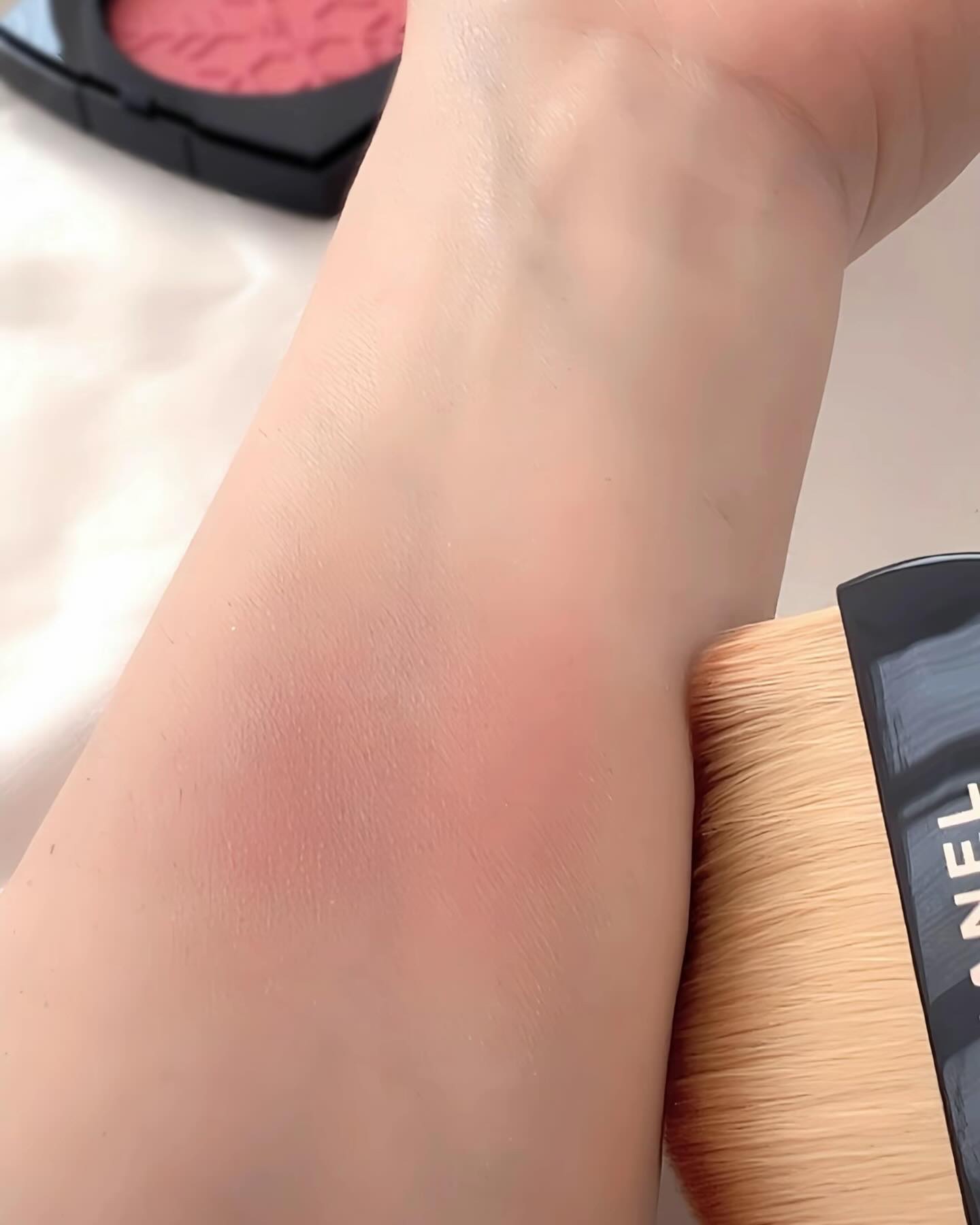 手に塗ってみてパッと見ファンテジードゥシャネルの方が透明感が出るように見えますが頬にのせると日焼けしたコーラル感の強い発色 レベージュヘルシーグロウブラッシュローズポレールは手で見るとオレンジっぽいけど頬にのせると透け感ローズで透明感が出る 意外でした❤️ ジュのナルスィスやツイードのツイードピンクよりも肌に透明感が出た意外なチーク これがパーソナルカラーなのか