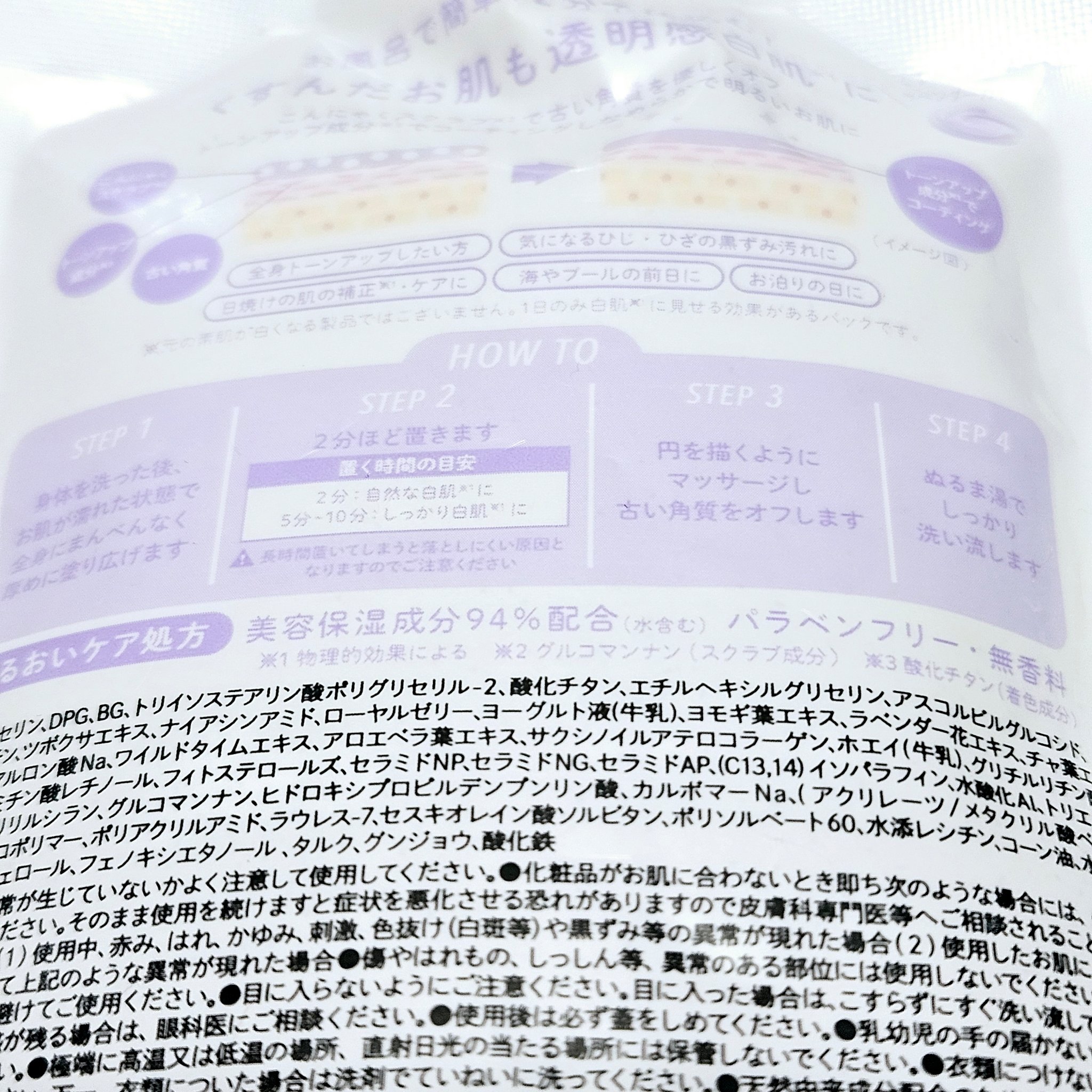 - 【数量限定】いつでも全身まるごと透明感のある白肌*1が叶う こんにゃくスクラブ*2でくすみの原因となる古い角質を優しい使い心地でオフ。トーンアップ成分*3で表面をコーティングすることで明るい印象のお肌*1に♡ 天然由来のスクラブで全身の古い角質を除去してなめらかなお肌に。ナイアシンアミドやグリチルリチン酸2Kなど美容保湿成分を98%配合(水含む) *1 物理的効果による *2 グルコマンナン(スクラブ成分) *3 酸化チタン(着色成分)