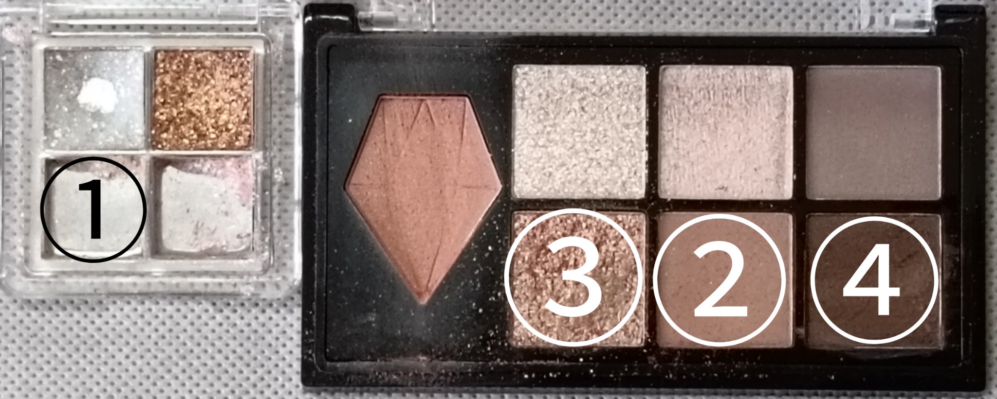 無印良品 UVベースコントロールカラー SPF 50+・PA+++ 旧 ピンク 上下左右によく振ってから顔全体にムラなく塗り広げる。 CEZANNE ナチュラル チークN 04 ゴールドオレンジ 両頬に濃いめにのせる。 U R GLAM UGTドリームアイシャドウパレット 06c ピーチシュガー メインのアイシャドウ。