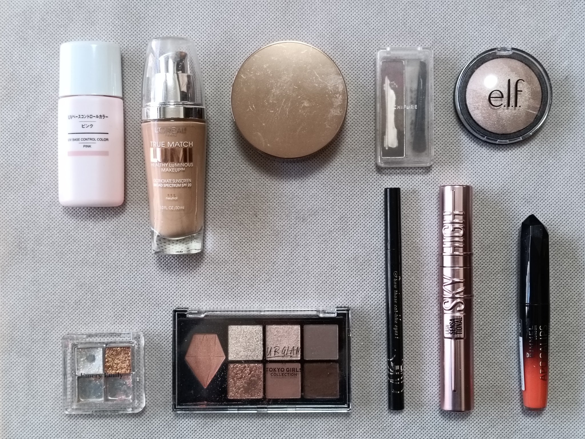 無印良品 UVベースコントロールカラー SPF 50+・PA+++ 旧 ピンク 上下左右によく振ってから顔全体に塗布する。 U R GLAM UGT マルチパーパスアイパレット 両頬に濃いめにのせる。 MAYBELLINE NEW YORK スカイハイ 01 ブラック まつ毛全体にたっぷり塗布する。