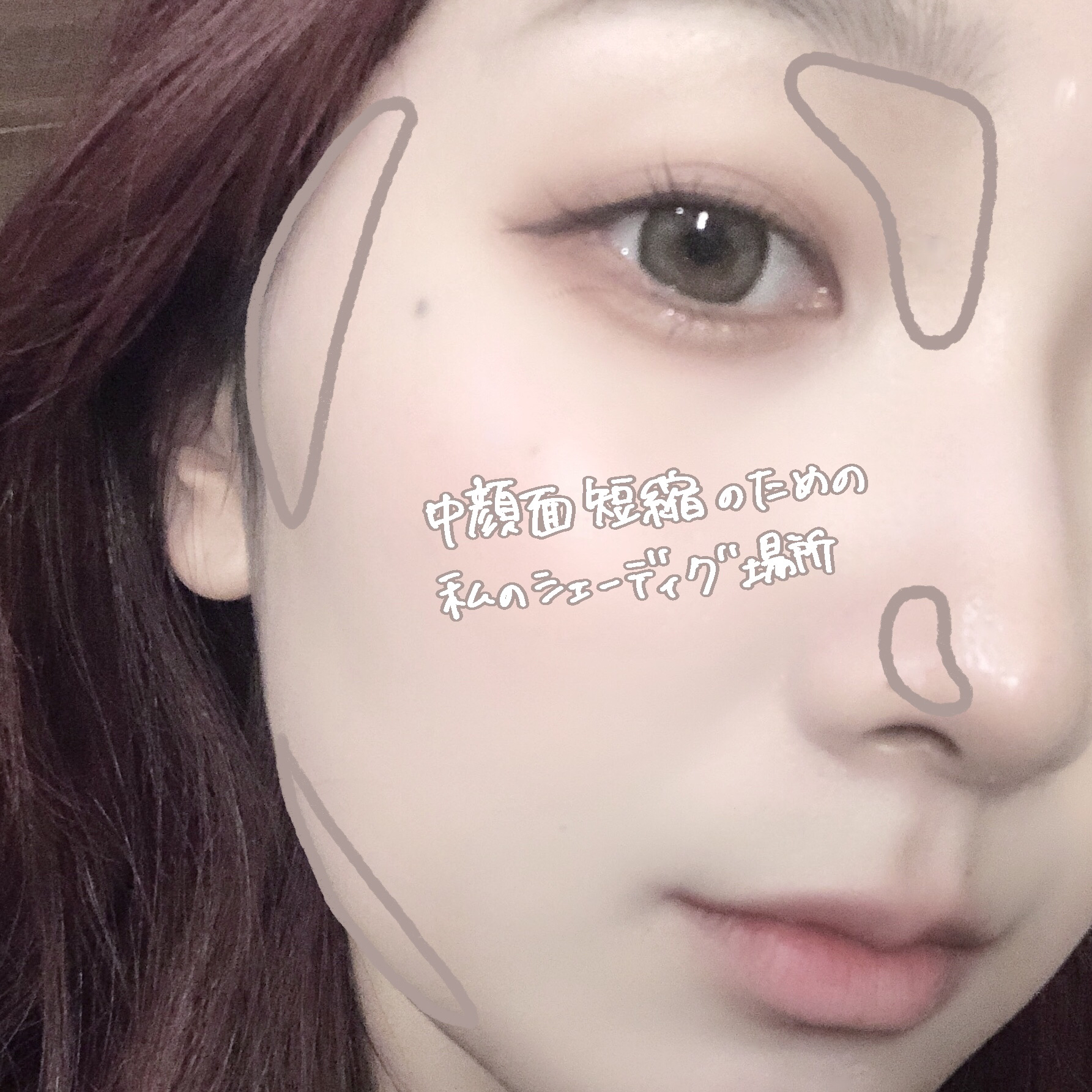 鼻根のハイライト→シェーディングに変え、その少し下にハイライトをいれます!🔥 そうすることで2つのハイライトの位置が近づき、中顔面の短い人のように見えるんです! また、要素が1つ増えることで余白を埋める効果もあります♪