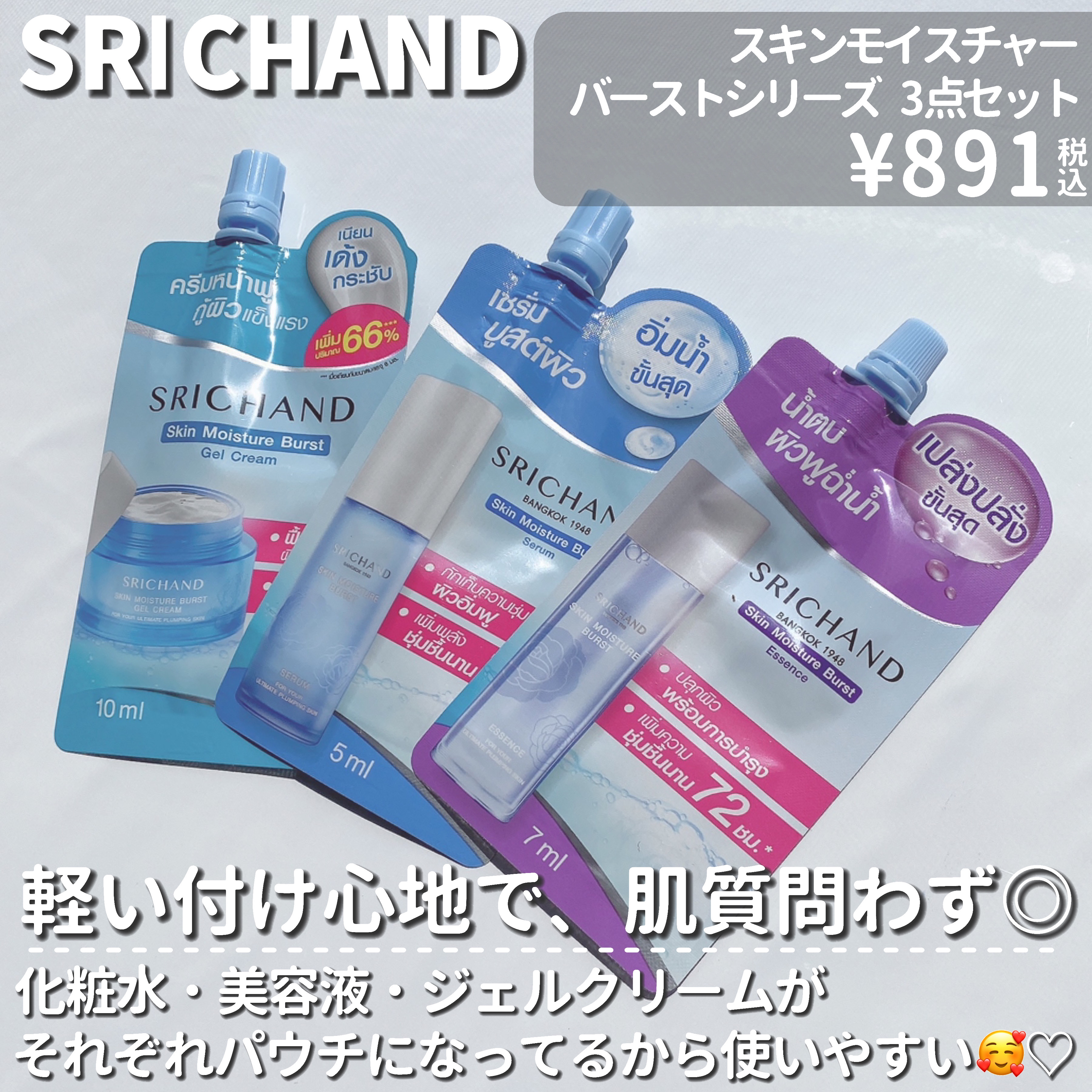 9/16敬老の日には、大切な人に贈り物しよ💖・・・・・☑︎スキンモイスチャーバーストシリーズ3点セット¥891(税込)💭SRICHAND(シーチャン)☑︎ブライト&ブルーム24スキンケアパウダー¥1,980(税込)💭CathyDoll(キャシードール)☑︎モンスーンカラーマスカラ03¥1,089(税込)☑︎スキニーブロウペンシル06¥550(税込)☑︎ヒアルロン酸リップマスク02¥880(税込)💭REUNROM(レンロン)☑︎トラベルセットエナージングウッド¥1,980(税込)・・・・・💭プレキャン情報→9/16(月)までタイコスメ・タイ雑貨の写真をタグ付け投稿で、抽選で3名様にタイコスメセットが当たるプレゼントキャンペーン開催💡詳しくはJFラボコスメのSNSをチェックしてね🐰💖・・・・・💭幅広い年代の方が使えるタイコスメ✨💭脂性肌の私は、高温多湿のタイで作られたコスメがまじで肌に合う👼💭9/16に敬老の日も来るし、いつもお世話になってる人にプレゼントであげると喜ばれる事間違いなし🥰しかも今回紹介する商品はどれもプチプラだよ〜✌️!!💭おしゃれでプレゼントにも適してるタイコスメぜひチェックしてみてね🐰💖・・・・・💭SRICHAND(シーチャン)☑︎スキンモイスチャーバーストシリーズ3点セット¥891(税込)→化粧水・美容液・ジェルクリームがそれぞれパウチになってるから使いやすい🥰✨全体的に軽い付け心地だから、肌質問わず使いやすい印象♡☑︎ブライト&ブルーム24スキンケアパウダー¥1,980(税込)→シーチャンのパウダーは何個も持ってるぐらい崩れにくさに長けてて大好き🥹!!これはプレストになってて、付属のパフでポンポンするだけでなめらかなフィルターがかった肌完成✨・・💭CathyDoll(キャシードール)☑︎モンスーンカラーマスカラ03¥1,089(税込)→しっかり発色・まつ毛に密着するようなもったりとした液が特徴🍒今回使用した03はピンクレッド系でいつもブラックを使う事が多い方は雰囲気もがらっと変わるよ💡☑︎スキニーブロウペンシル06¥550(税込)→とにかくほっっそい🥺!!眉一本一本描き足すのにぴったりな硬さ&発色♡カラーも濃すぎず、垢抜け眉間違い無し✌️☑︎ヒアルロン酸リップマスク02¥880(税込)→しっかりもったりテクスチャーで乾燥した唇を集中トリートメント👼持ち運びにも便利なサイズ感だし、家でも出先でもうるうるキープ♡💭REUNROM(レンロン)☑︎トラベルセットエナージングウッド¥1,980(税込)→ハーブを主要成分に用いた、ヴィーガン処方✨シャンプー・トリートメント・ボディソープと3点揃ってるから、プレゼントしたい相手が温泉によく行く人とかにも良いかも〜🥰・・・・・#PR#レンロン#シーチャン#キャシードール#マスカラ#パウダー#リップ#スキンケア#感謝の心を届ける#敬老の日#タイコスメ#Qoo10メガ割#秋っぽ先取りメイク#キレイを目指す新習慣#至高のツヤ髪レシピ#美ボディの相棒グッズ