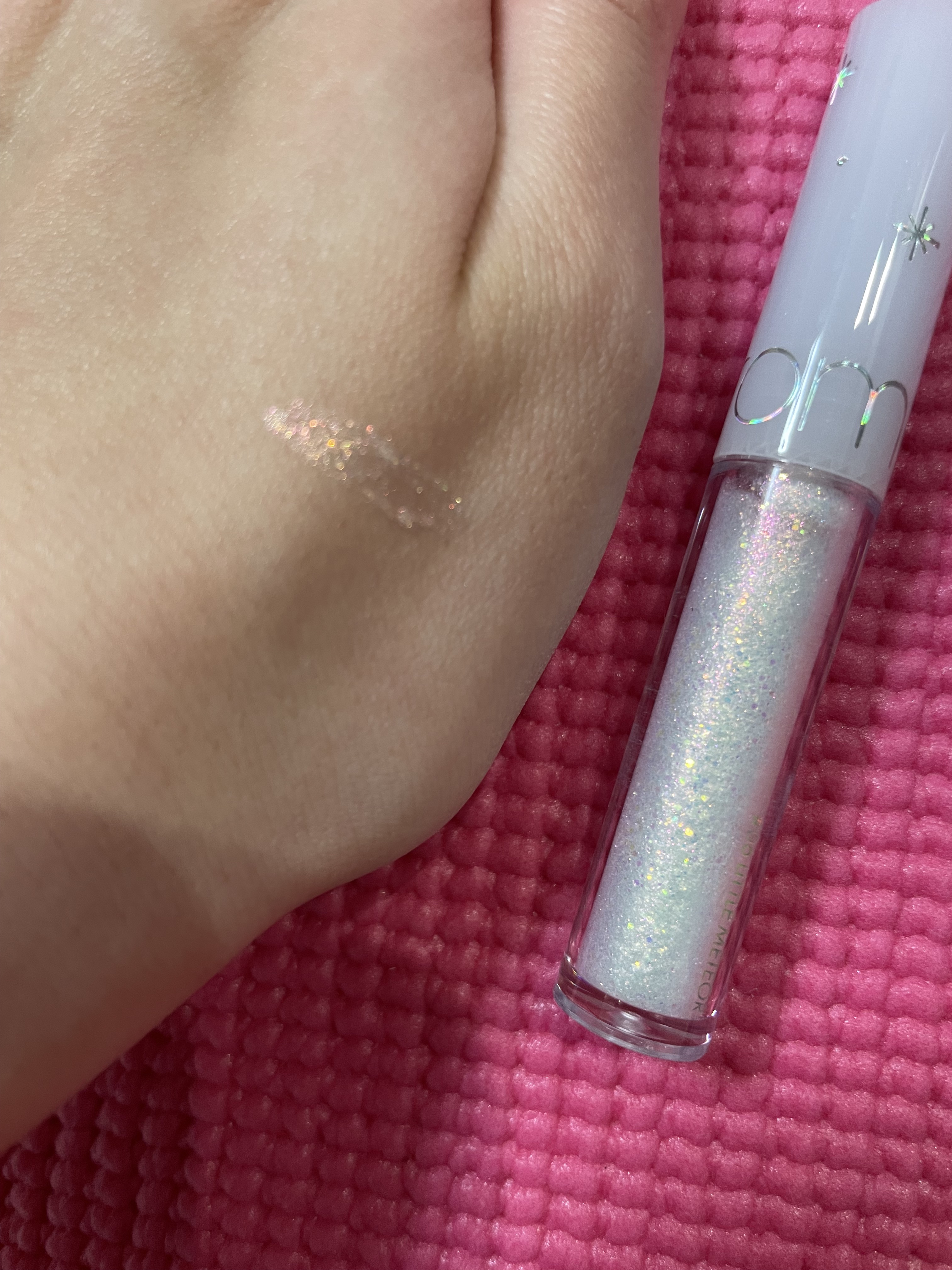 つけてみると結構ピンク感がある。 粘度があまりないシャバっとしたテクスチャーだけど、しっかり貼り付くというか取れにくい。 リキッドだけど塗っても下地がよれにくい。 rom&nd リキッド グリッター シャドウ 06リトルメテオ #rom&nd#ロムアンド#グリッター #透明感爆上げメイク