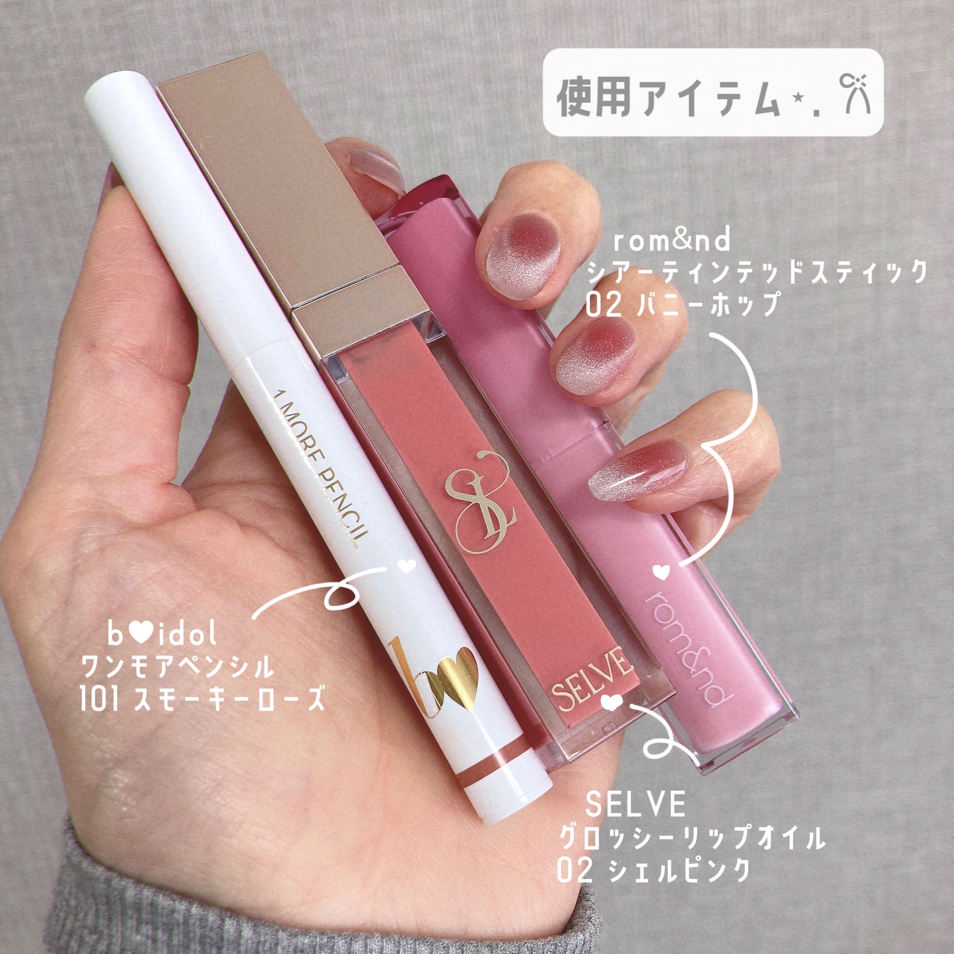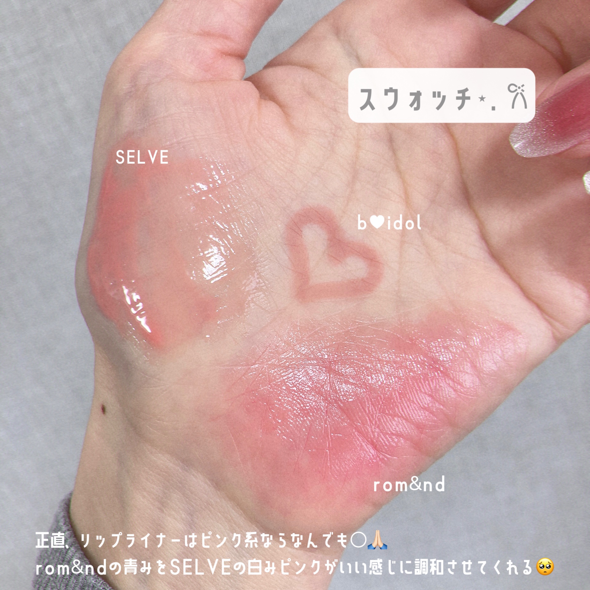 甘々自称バレエコアな日🩰(?)のリップが自信作なのでシェア🤝🏻💓⋆.𐙚rom&nd…シアーティンテッドスティック02バニーホップ🐰⋆.𐙚SELVE…グロッシーリップオイル02シェルピンク🐚⋆.𐙚b♥idol…ワンモアペンシル101スモーキーローズ🥀ロムアンドの青みをSELVEの白みピンクがいい感じに調和させてくれる🥺イエベもOKなピュア赤ちゃんリップ👶🏻🍼ロムアンドと、SELVEは過去提供品です🙏🏻🙇🏻♀️#リップメイク#リップレシピ