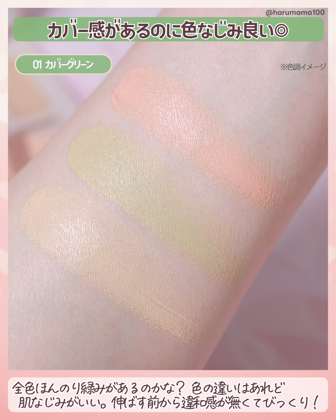 パケが可愛くて気分が上がる🎀 なめらかなテクスチャーで、しっとりと潤いのある心地いい使用感♡ グリーンカラーのコンシーラーも入っているので、気になる小鼻周りの赤みをカバーするのにも使えて魅力的すぎる!