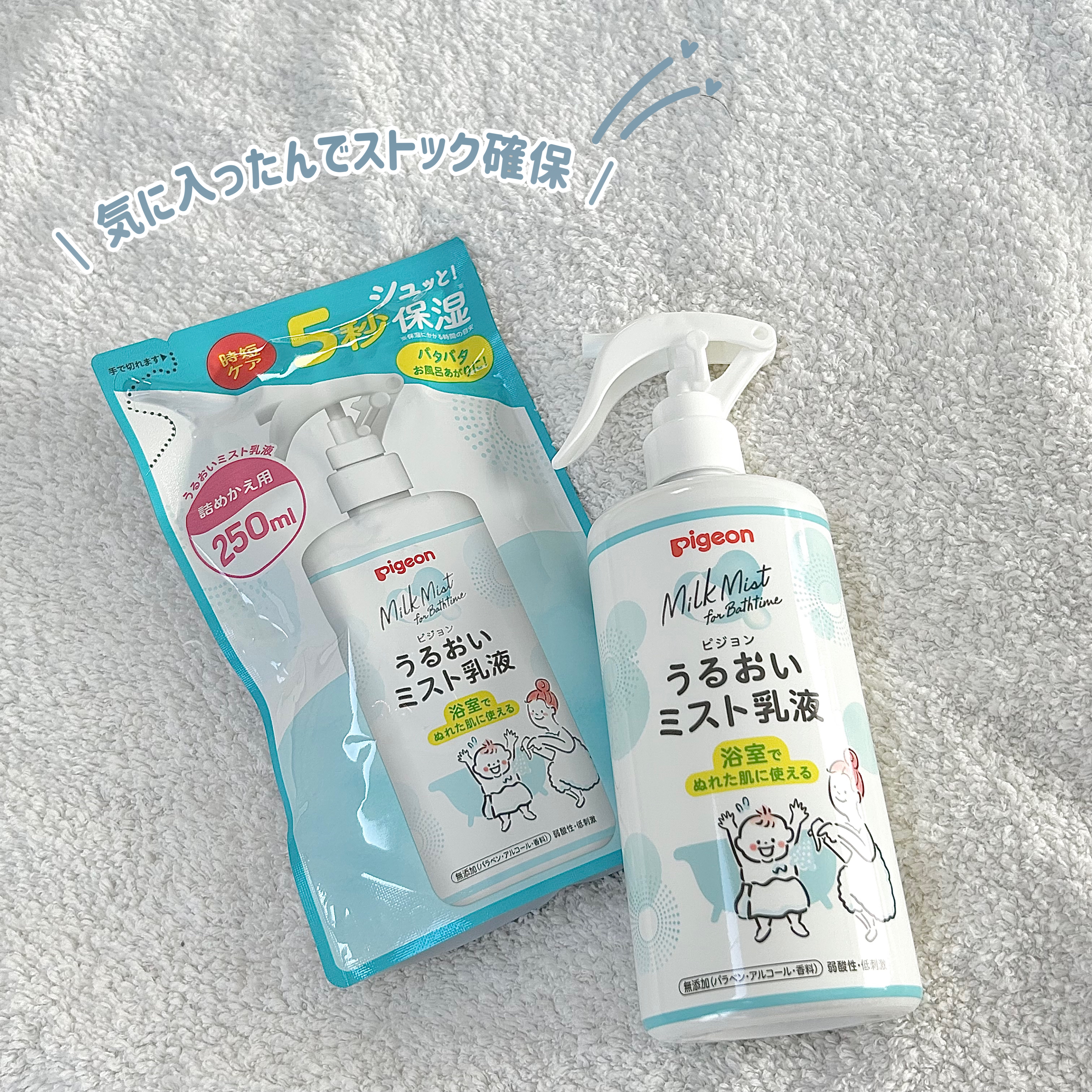 ピジョン うるおいミスト乳液詰替 250ml以前本体を買って、かなり良かったので詰め替え用を買いました。濡れた体にシュッと吹きかけて、あとはタオルで拭くだけなので、小さいうちの子も、使いやすいからまたこれ買って!と珍しく気に入ったようで。保湿力もあるし、簡単だし、リピ確定。#ピジョン#うるおいミスト乳液#ボディミスト