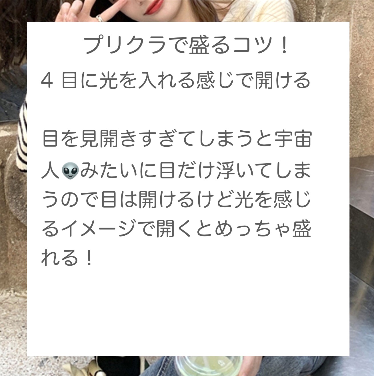あんにょん~♡♡のあですっ!今回はプリ撮る時に盛る方法を紹介します!もうすぐクリスマスもあるし参考になればうれしいです🙌💓それでは〜?START!𓂃𓂃𓂃𓂃𓂃𓂃𓂃𓂃𓂃𓂃𓂃𓂃𓂂𖡼.𖤣𖥧𓈒◌܀プリで盛るコツ!詳しくは画像をみてね✨1撮る前に前髪を直す📷2盛れる方の顔を知っておく3歯を出しすぎない🦷4目に光を入れる感じで開ける👀𓂃𓂃𓂃𓂃𓂃𓂃𓂃𓂃𓂃𓂃𓂃𓂃𓂂𖡼.𖤣𖥧𓈒◌܀質問あったらコメントください!待ってまーす🫡ばいちゃ➰🤍📎💬𝑇ℎ𝑎𝑛𝑘𝑦𝑜𝑢#プリクラ#プリクラで盛る#わたウサ#垢抜け#クリスマス#可愛くなりたい