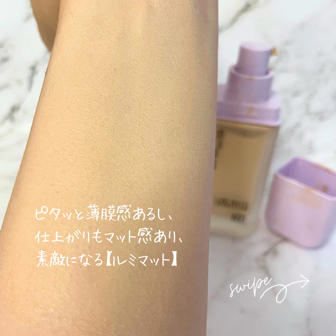薄膜なのに崩れにくい ルミマットファンデ テクスチャは伸ばしやすく 少量で顔全体に塗れて 自然な素肌感のある仕上がりになります。 伸びがいいので いつも半プッシュで使用しています。 それでもまだまだ余ります。 毛穴もカバーしてくれて 乾燥しにくく、崩れにくいので とても使いやすかったです。