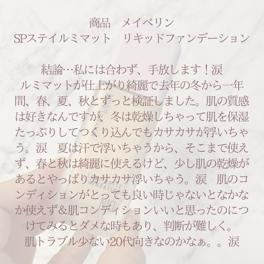 肌のコンディションめちゃくちゃいい時は良いの。冬は肌のカサカサがどうやっても目立つ。こんなに肌のコンディション悪かった???となるやつ笑そうすると使える日が少なすぎる。冬だからダメなんだと春、夏、秋、そしてまた冬と2巡目も使ったが、なかなかダメ。肌の調子が良い日は仕上がり良いんだけどなぁ。若い子向きなのかなぁ、、、😭MAYBELLINENEWYORKSPステイルミマットリキッドファンデーションN10¥2,992#リキッドファンデ#メイベリンファンデーション#ルミマット#ファンデーション#ベースメイク
