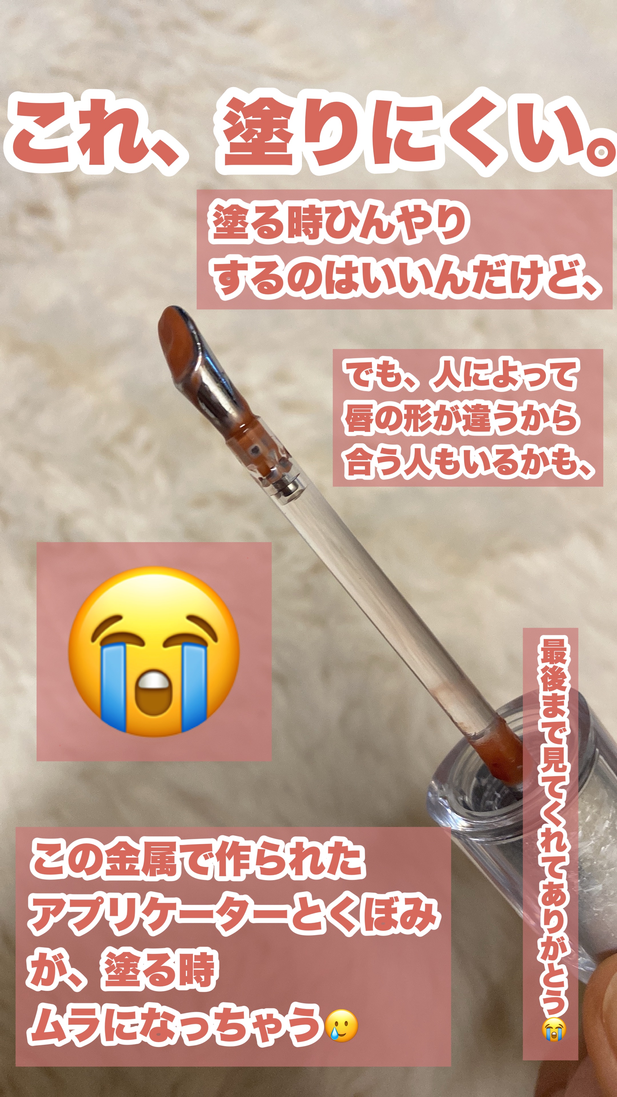 【イエべ秋大優勝ちゅるちゅるティント🧡】私ブルベ夏だけど見つけて衝動買いしちゃった♡ガチで可愛い!色残りも良いから全イエべ秋使って欲しい🥺でもね、ひとつだけ、、、塗りにくい(ごめんなさい)私の唇だとムラになっちゃう🥺チップが金属製なのがひんやりして気持ちいんだけど、それがかえって塗りにくく感じた、、、でも可愛いからかう価値はあり!!!!本当にイエべ秋に買って欲しい😍#イエベ秋#中国コスメ#ジュデードール#ツヤリップ