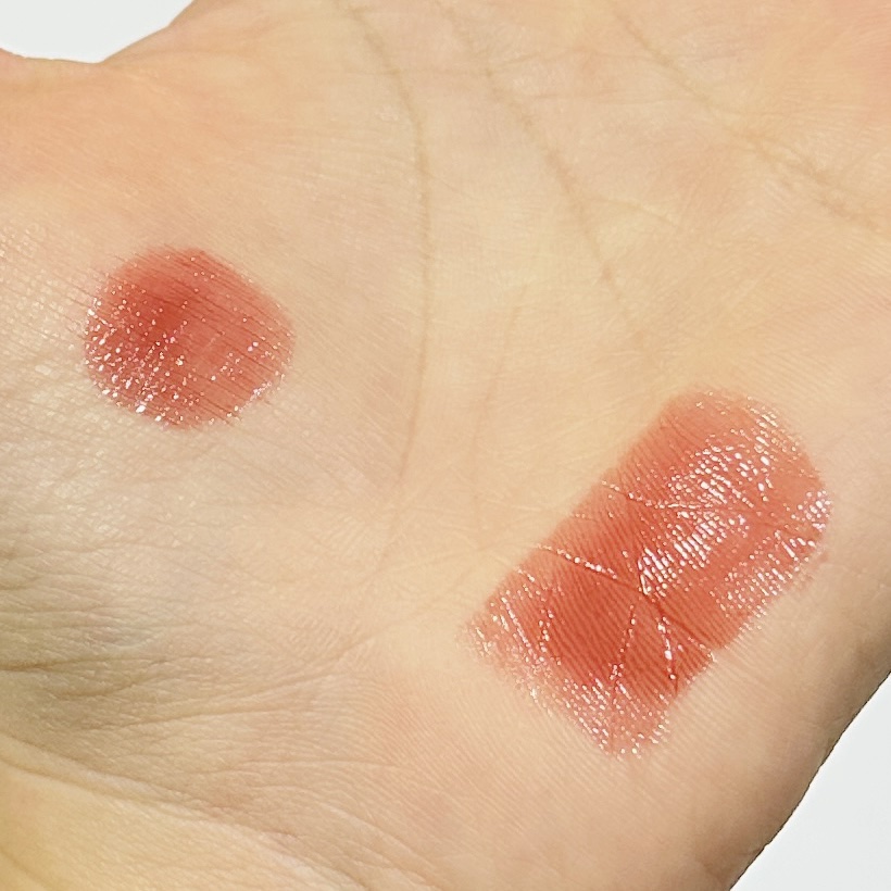 カラーとテクスチャーなどとてもお気に入りなので、紹介したいと思います✨ 軽いテクスチャーで、ツヤリップなのにベタつかない◎ 時間経ったらツヤ感は消えるが、色は残ってる。