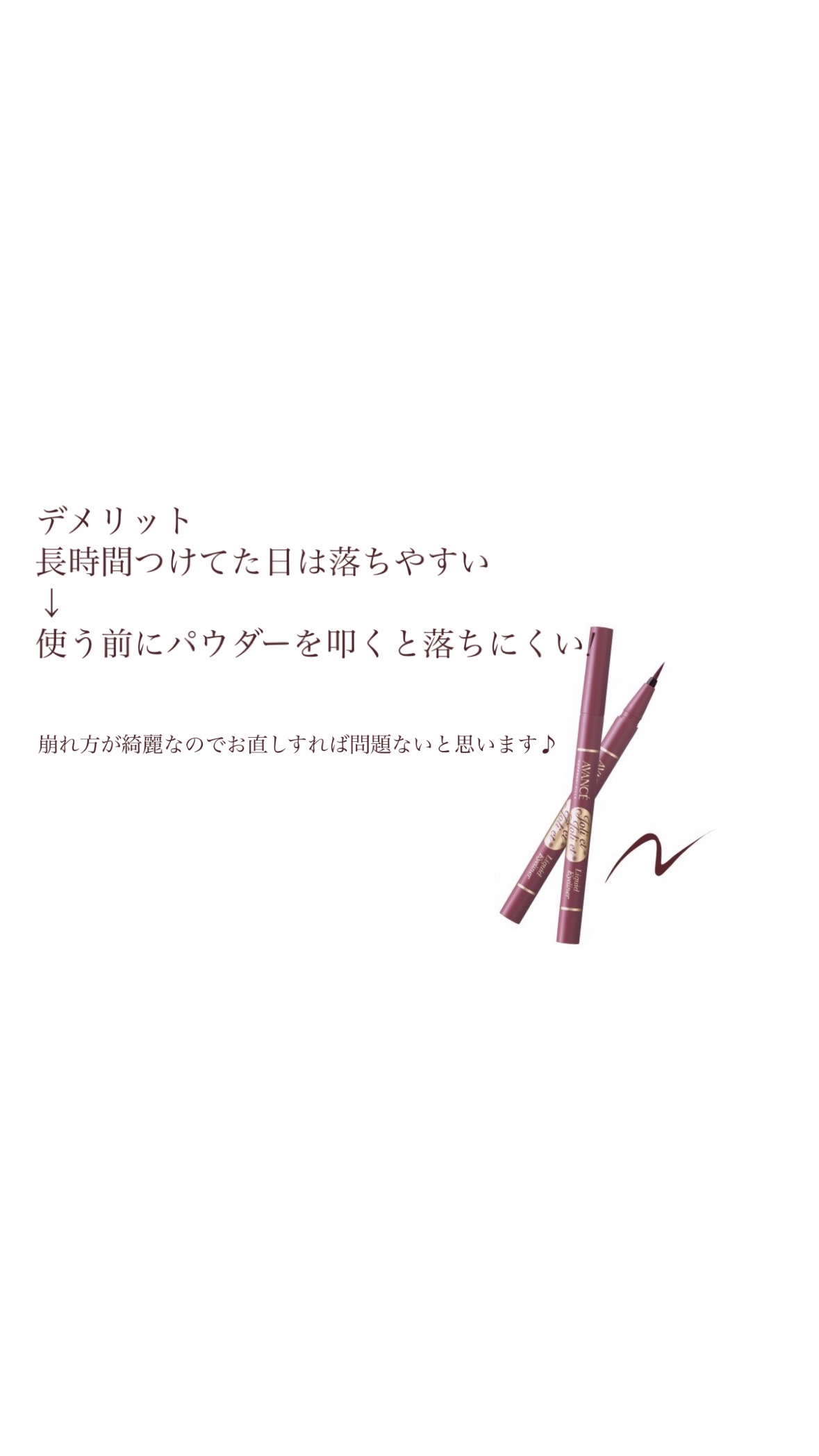 時間が経っても落ちにくいアイライナーを探し、ようやく見つけられました🙌🏻有名なアイライナーは(購入やテスターで)試してみましたが、どれも滲んだり剥がれてしまったりして、線を引いた時は綺麗でも午後には消えてしまうことがほとんどでした。アヴァンセ...