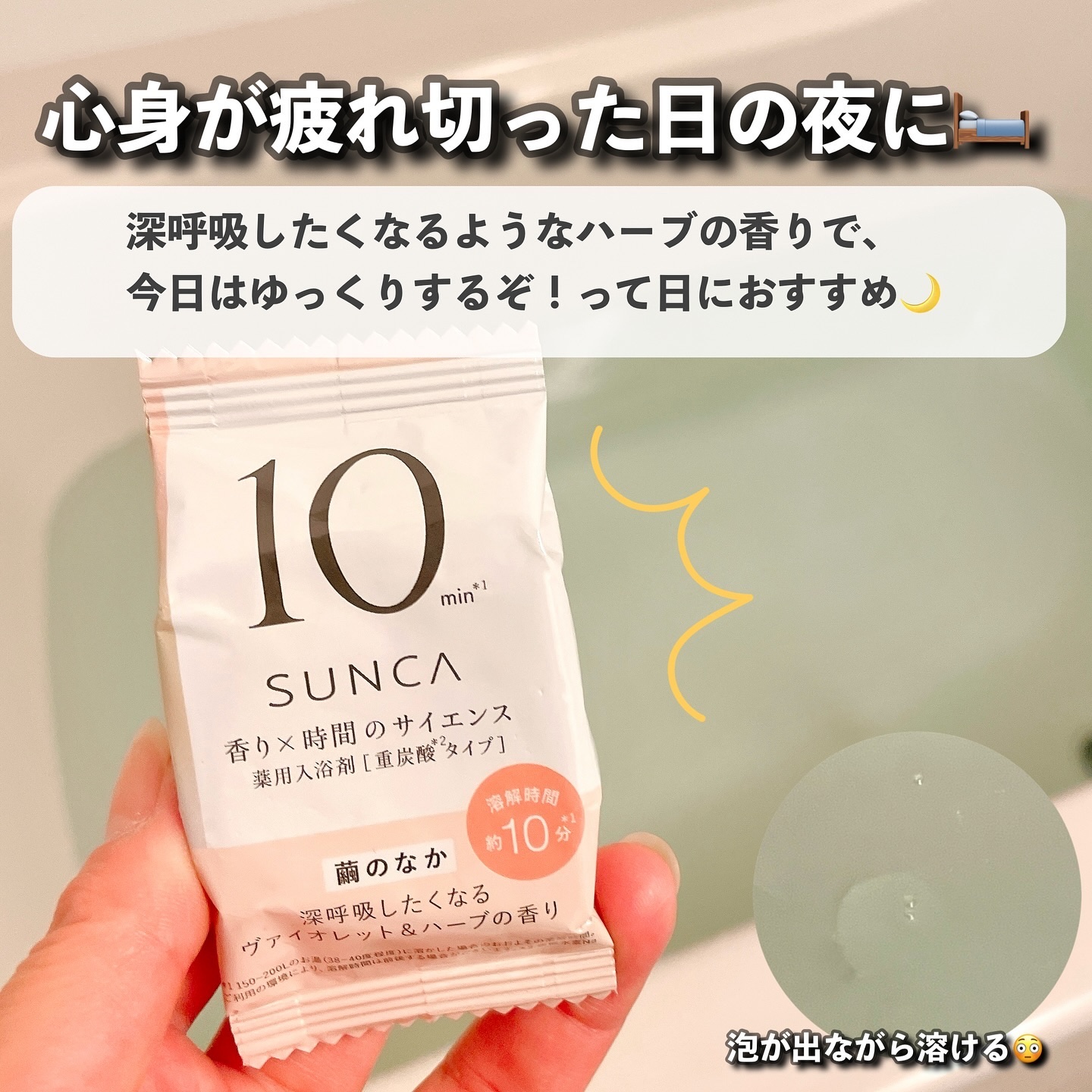【使った商品】SUNCA医薬部外品SUNCA入浴剤アソート12錠¥1,210〜繭のなか:40g(1回分)×2錠月のかさ:40g(1回分)×2錠【商品の特徴】サイトから引用↓その日の気分と時間で選ぶ2つの香り付き重炭酸お試しに使ってみたい方へちょっとしたプチギフトとしてもオススメです。繭のなか&月のかさ 日によっての入浴時間で使い分けたい方へ。繭のなか(溶解時間約10分※2)深呼吸したくなるヴァイオレット&ハーブの香り。月のかさ(溶解時間約3分※2)開放感のあるネロリ&ライラックの香り。アソート:日によっての入浴時間で使い分けたい方へ。繭のなか:ゆっくり湯船に浸かりたい方、湯船で心身をゆっくりほぐしたい日や、1日色々あって心身が疲れ切った夜に。月のかさ:忙しくてタイパ重視の方、心身共にすっきりさせたい日や、1日頑張りたい前日の夜や当日の朝に。※1炭酸水素Na※2150~200Lのお湯(38~40度程度)に溶かした場合のおおよその溶解時間。ご利用環境により、溶解時間は前後する場合がございます。【良いところ】タブレットだからそのままポンと入れるだけ!【イマイチなところ】少し値段が高い