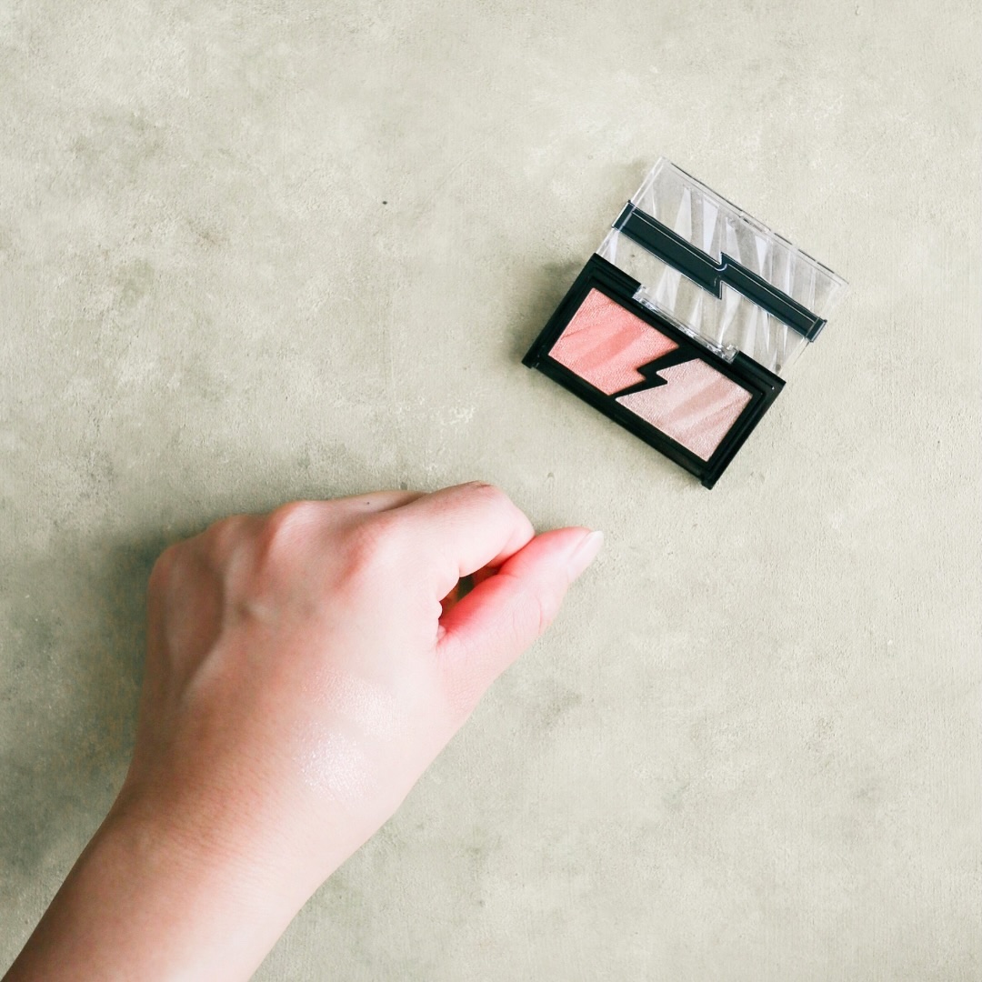 存在感のある大粒グリッターの2色が入った、KATEのエレクトリックショックアイズ. 手元に出したときは結構きらめきが強くて正直大丈夫かな?と思っていたけど、目元にのせるとキラキラなのにちゃんと馴染む質感😳. エレクトリカルカラーは柔らかい透け感コーラルのベースに繊細なゴールドパールがチラチラ輝く◎.