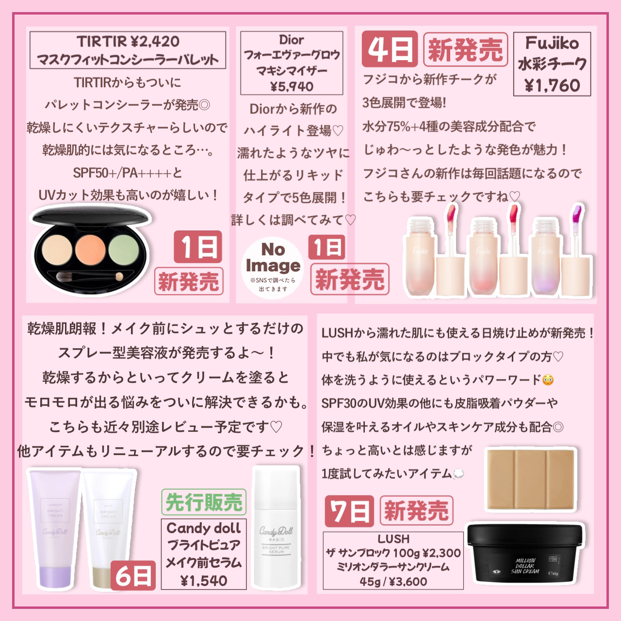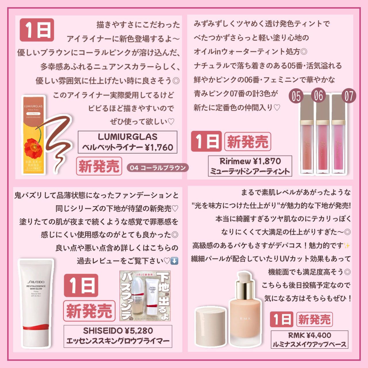 【新作まとめ】2024年3月前半発売コスメ🌟┈┈┈┈┈┈┈┈┈┈🌼この投稿で使用している画像は全てLIPSに登録されている画像になります🌼どうもりちゃです🐰今回も新作コスメの発売情報をまとめてみました!毎回大好評のコスメカレンダー🗓💖今期発売のものは主に🌸春らしい柔らかい発色のコスメ・ピンク系コスメ🌸が多い印象!また、個人的注目は#diorのフォーエヴァーグロウマキシマイザー#jillstuartのダイヤモンドディップスコンシーラー#リリミュウのピンクマーガレット#fujikoの水彩チーク❁#haomiiのメルティフラワーリップティント#revlonキスシュガースクラブスウィートサクラが特に気になっています🤍🤍実際に購入したらまたレビュー載せますね♥﹏﹏﹏﹏﹏﹏﹏﹏﹏﹏﹏既にレビュー済み&投稿予定のものはこちらから⬇️︎︎◌SHISEIDO/エッセンススキングロウプライマーhttps://lipscosme.com/posts/6041062?_t=zLqY&_r=r26D︎︎◌CEZANNE/耐久カールマスカラグレージュhttps://lipscosme.com/posts/6035188?_t=zLqY&_r=r26D︎︎◌CEZANNE/極細アイブロウマスカラhttps://lipscosme.com/posts/6037286?_t=zLqY&_r=r26D︎︎◌CandyDoll/ブライトピュアメイク前セラム▶︎https://lipscosme.com/posts/6094443?_t=zLqY&_r=r26D︎︎◌RMK/ルミナスメイクアップベース▶︎https://lipscosme.com/posts/6071840?_t=zLqY&_r=r26D︎︎◌CEZANNE/ベージュトーンアイテムピーチベージュ▶︎https://lipscosme.com/posts/6083064?_t=zLqY&_r=r26D参考になったらいいね&フォローお願いします🌟(保存しておくと後からでも見れます📌)#新作コスメ#コスメ発売情報#デパコス#プチプラコスメ#新作リップ#新作コスメ2024#新作化粧下地#セザンヌ_新作#新作アイシャドウ#限定カラー#限定コスメ#水飴リップ#韓国コスメ