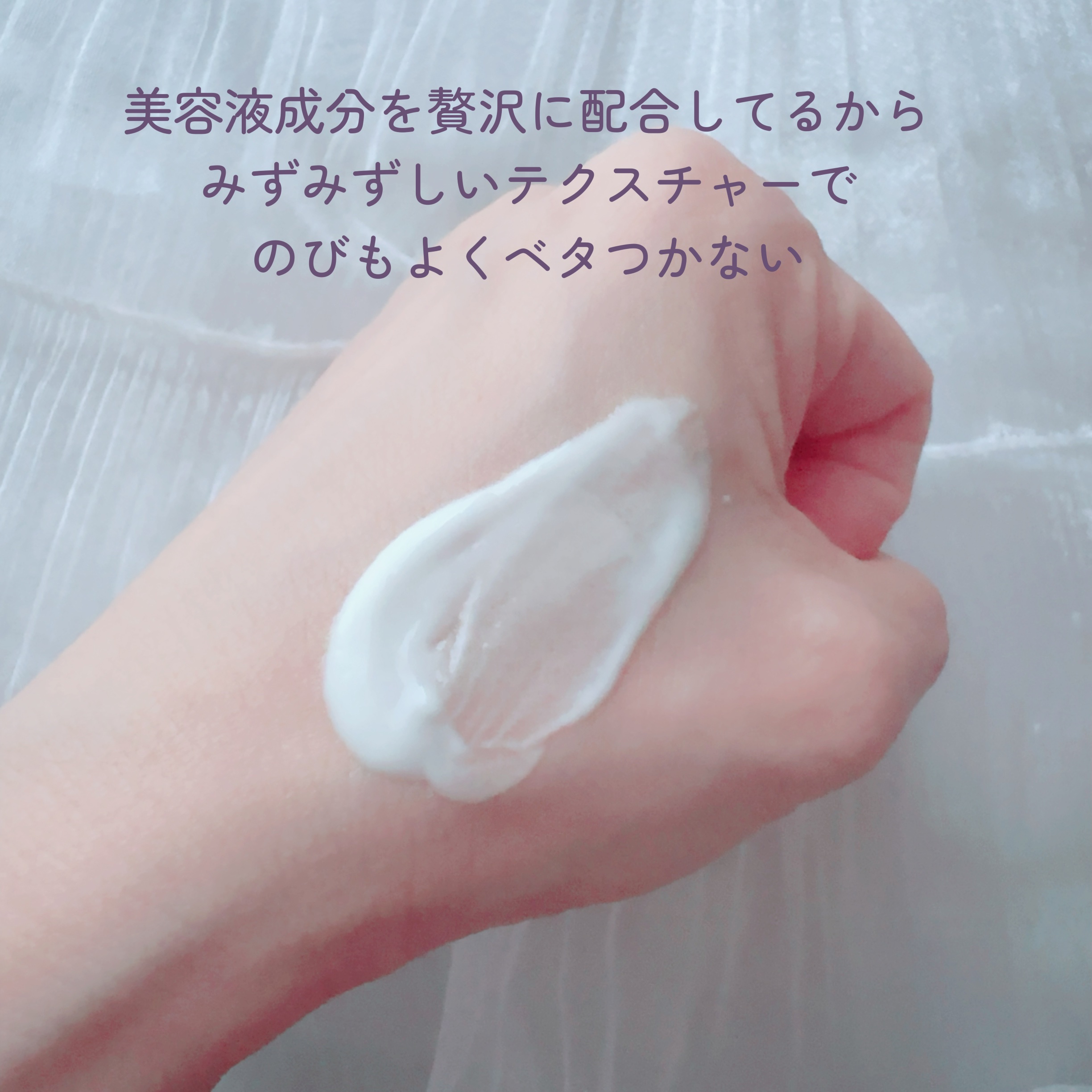 手にとってみると、まるで乳液のようなクリーミーなテクスチャーで伸びがよく軽い付け心地。 かといってペトっと残る感じもなく伸ばした瞬間肌に馴染んでサラサラした肌触り。 容量もかなりあるので、腕とかにも惜しまず使えるのもいいところ🥰