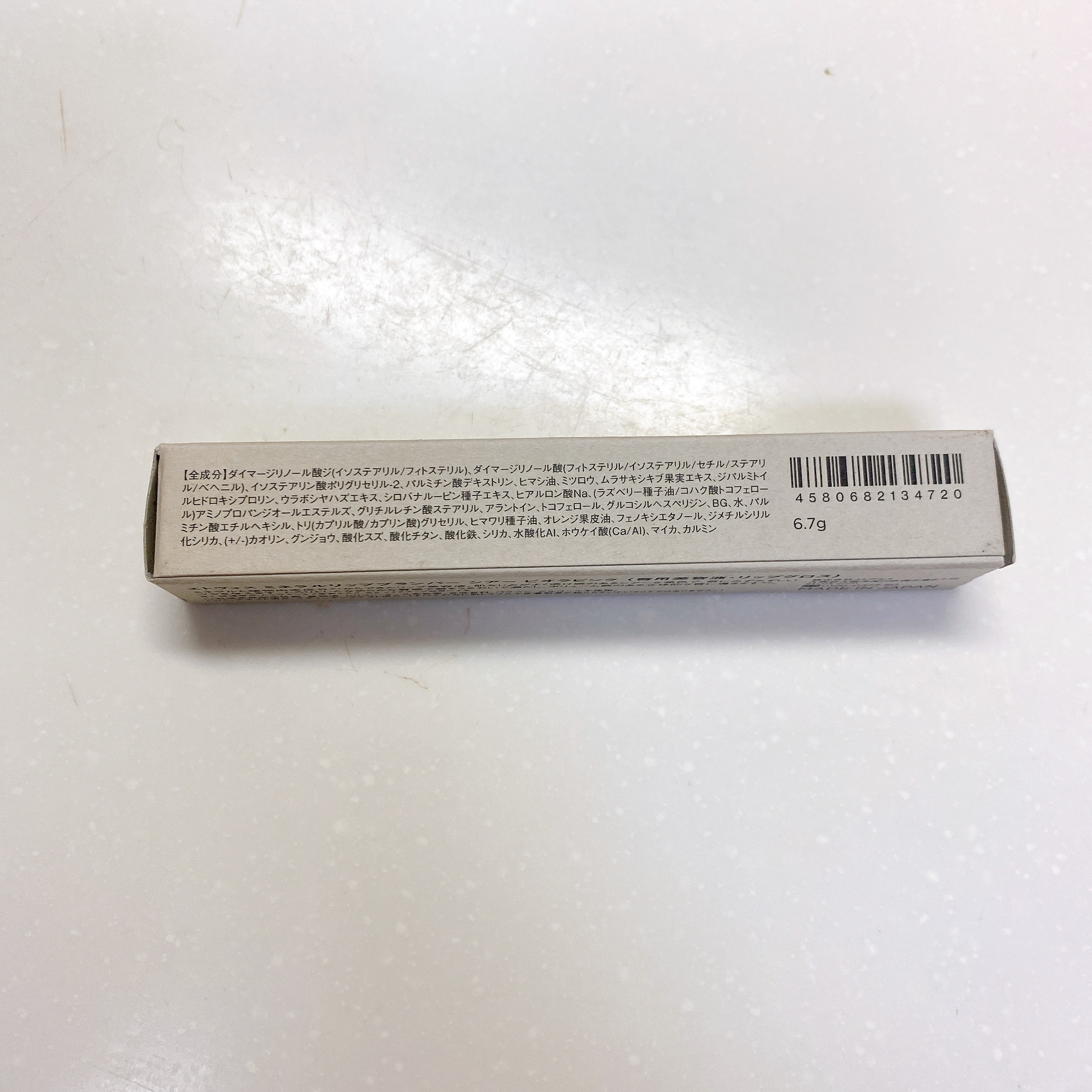 - ダイマージリノール酸ジ(イソステアリル/フィトステリル)、ダイマージリノール酸(フィトステリル/イソステアリル/セチル/ステアリル/ベヘニル)、イソステアリン酸ポリグリセリル-2、パルミチン酸デキストリン、ヒマシ油、ミツロウ、ムラサキシキブ果実エキス、ジパルミトイルヒドロキシプロリン、ウラボシヤハズエキス、シロバナルーピン種子エキス、ヒアルロン酸Na、(ラズベリー種子油/コハク酸トコフェロール)アミノプロパンジオールエステルズ、グリチルレチン酸ステアリル、アラントイン、トコフェロール、グルコシルヘスペリジン、BG、水、パルミチン酸エチルヘキシル、トリ(カプリル酸/カプリン酸)グリセリル、ヒマワリ種子油、オレンジ果皮油、フェノキシエタノール、ジメチルシリル化シリカ、カオリン、グンジョウ、酸化スズ、酸化チタン、酸化鉄、シリカ、水酸化Al、ホウケイ酸(Ca/Al)、マイカ、カルミン