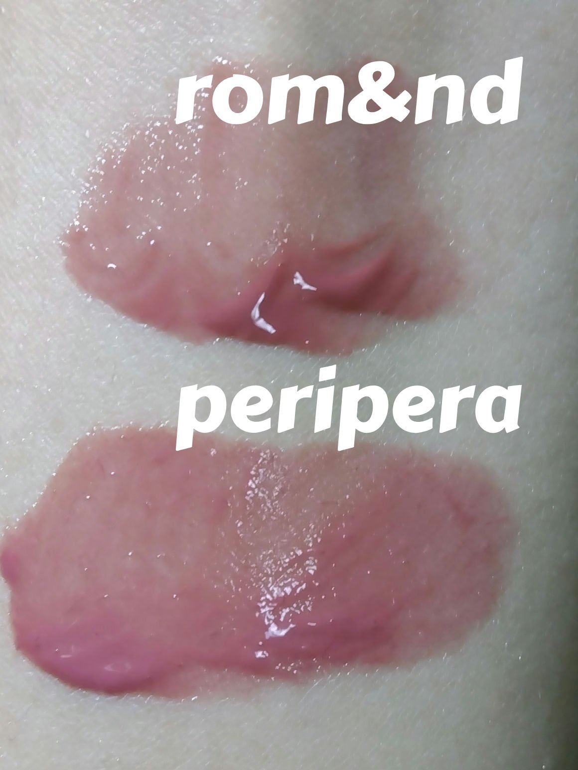 ロムアンド→塗った直後はピンクベージュ、放置・ティッシュオフすると青みが出てくる ペリペラ→塗った直後は青みのある赤ピンク、放置・ティッシュオフすると赤み、ブラウンみが出てくる ロムアンドはもったりとしていて、ペリペラはウォータリーでさらさら ロムアンドの方が液のもったりとした質感が時間が経っても唇に残るので乾燥を感じにくい