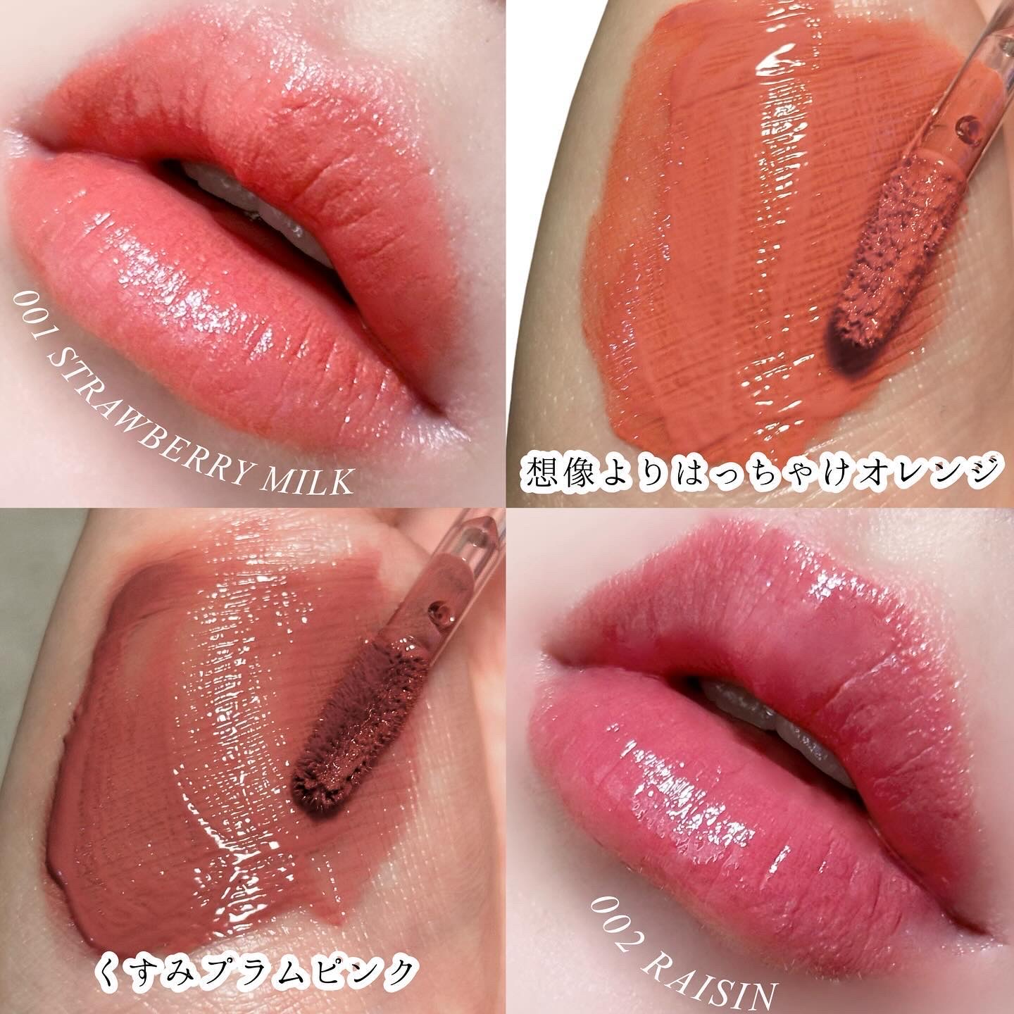 色落ちしにくく、美容液成分が配合されています😳4色とも発色が良く華やかな印象に。なめらかな塗り心地でぷっくりツヤっとした仕上がりです😉☺️ 鈍感な私はミント感をあまり感じませんでした。 個人的には1番落ち着いたカラーの002が好みです🫰