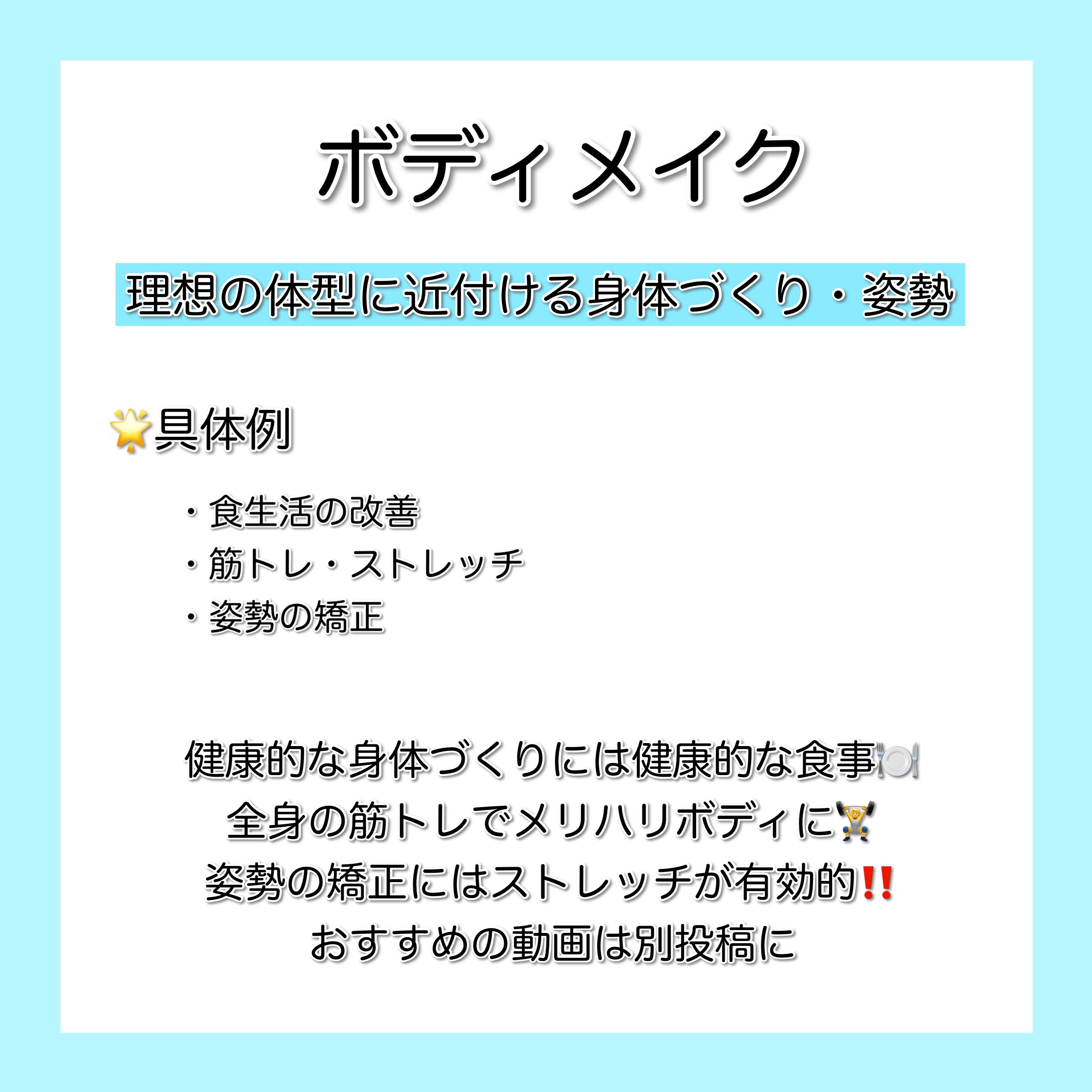 自分に何が似合うのか客観的に見て知る事。 PC・骨格・顔タイプ診断で研究する 健康的な身体づくりには健康的な食事の全身の筋トレでメリハリボディに!姿勢の矯正にはストレッチが有効的!! 清潔感を出すなら徹底すべき! ムダ毛処理も何をすれば良いのかわからなかったり、自分では気付かない体臭もケアして見えないところも垢抜け