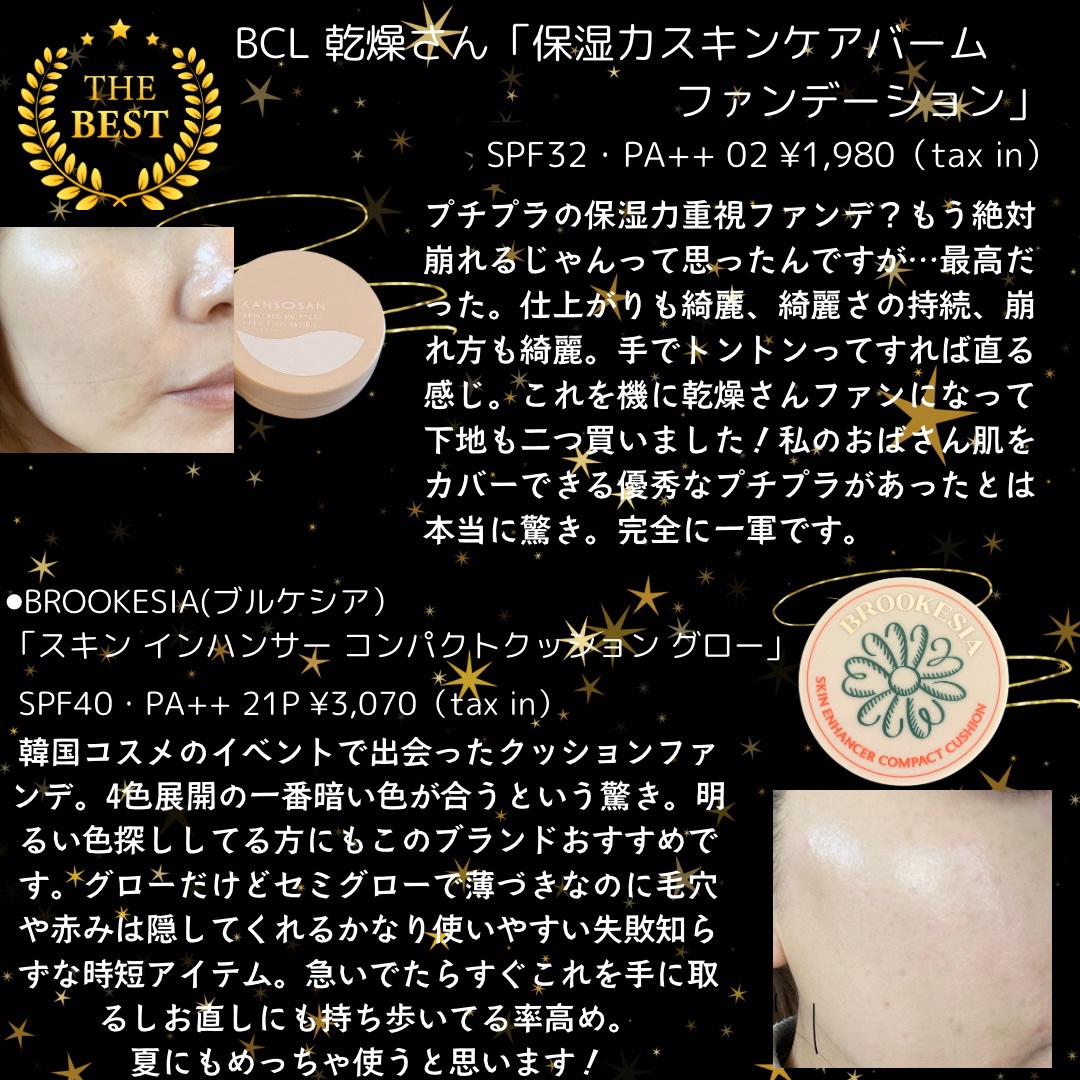 マイベスコス!!!メイク編(持っていたベスコスで出たものは除外します🥇アイメイクアイテム⚫︎Pmel「うそつきアイベース」 (ピメルパーフェクトアイベース)【限定】¥1,320(taxin) これ無しではメイクできない!お願いだから定番にしてください。数々のアイベースを試してきた“二重に溜まりまくる人間“形状、使い安さ、発色の変わらなさ、価格、全てがパーフェクト。⚫︎POLABA「3Dオアシスアイカラー」 02デイジーブーケ¥7,700(taxin) 大人の上品艶出しピンクメイクが叶うアイテム。左上はアイベースで、あのアイゾーンクリームにも含まれる美容成分が入っているとか。そのおかげてシワっぽくならずしっとりとしたツヤがものすごく綺麗。これは“BAだな“って使っていて思う仕上がり。ピンクの上品なグラデーションもたまらない…春の限定色も狙ってます。⚫︎INOUI(インウイ)「インウイアイズ」 【限定】07、【定番】01¥6,600(taxin)リフィル¥4,400(taxin) 栄一パレットがたくさんある中この価格で5色。しかもクオリティに妥協なしの最高品質。これは全人類におすすめしたい。私は中身が見える方が整理しやすいのでリフィル購入にしてます⚫︎BOBBIBROWN「リュクスアイシャドウクォード」 【限定】ミルキーウェイ¥10,450(taxin) 4色全てが宝物レベル。一生なくならないでー。リュクスアイシャドウのムーンストーンが人生コスメなので、このパレットはたまりません。ほんのりピンクなキラッキラと、ゴールドのキラッキラと、濁りのないホワイトのキラッキラと、これらと相性抜群のローズピンク。全色それぞれにベスコス!⚫︎GIVERNY(ジベルニー)「密着センシティブマスカラ」 02ブラックブラウン¥1,500(taxin) 繊細・ダマにならない・失敗知らず・程よい繊細なボリューム。ナチュラルで、でも繊細なボリュームは確実に存在するマスカラ。毎日使っていました。新しく「密着センシティブマスカラボリュームラッシュ」が出ているのでこちらも気になる。🥇チーク⚫︎INOUI(インウイ)「インウイチーク」 01ケース付き¥6,050(taxin)¥3,850(taxin) 01は私がだ・い・す・きなピンクゴールド。幸福感でます。ふわっと塗るとパール自然な立体感が生まれます。さすが自分を活かすインウイ✨🥇ベースメイク⚫︎EXCIA(エクシア)「コントラディクションエマルジョンファンデーション」 SPF20/PA++02¥8,800(taxin) 毛穴を消す魔法アイテム。スフレファンデみたいなテクスチャ。これは隠れ名品じゃない?高いけどこれは本当に買ってよかった。広めに使うなら01のベージュ。部分的に頬の毛穴や鼻の毛穴ならトーンアップしたい部位なので02ピンクがおすすめ。これはもちもいいしコスパ良しです。人生毛穴消しゴム。⚫︎BCL乾燥さん「保湿力スキンケアバームファンデーション」 SPF32・PA++02¥1,980(taxin) プチプラの保湿力重視ファンデ?もう絶対崩れるじゃんって思ったんですが…最高だった。仕上がりも綺麗、綺麗さの持続、崩れ方も綺麗。手でトントンってすれば直る感じ。これを機に乾燥さんファンになって下地も二つ買いました!私のおばさん肌をカバーできる優秀なプチプラがあったとは本当に驚き。完全に一軍です。