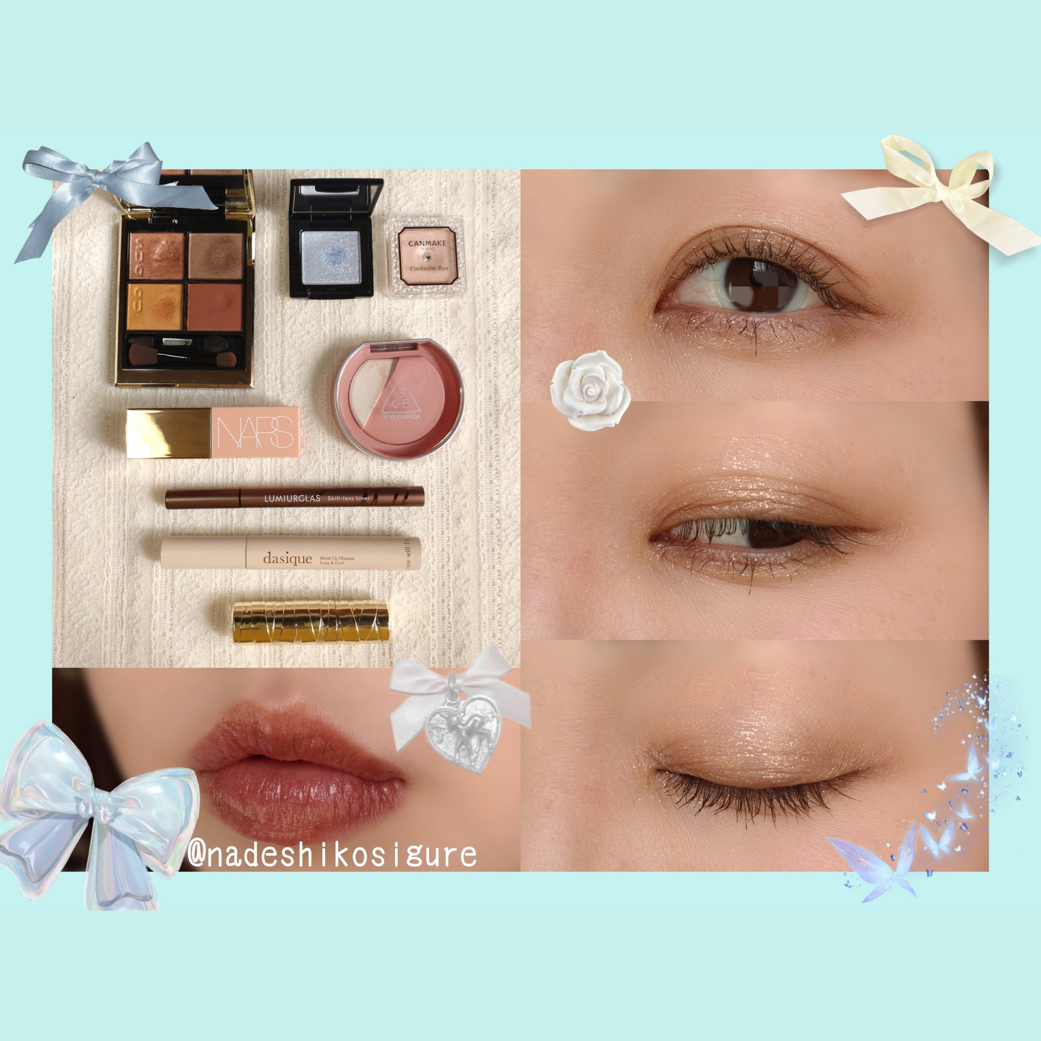 ベースの水色は濃く重ねなければほとんど分からず、とにかくラメがキラキラで透明感が爆発します💥 ゴールドのラメがメインなのでイエベの私でも使えます。 オレンジのアイシャドウと合わせると少しピンクがかった感じになります。