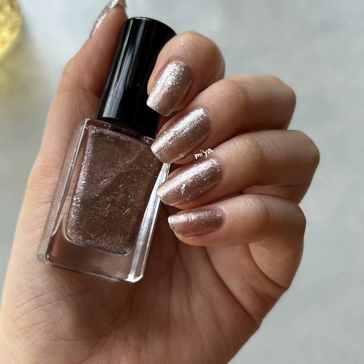 今回使用のネイルカラーは、ALBIONアルビン エレガンスラズルエナメルラッカー ピンクブラウン系の偏向色で光の当たり具合によってニュアンスが変わる♡ メタリックなシルバーゴールドカラーで同色のホロが入っている、とても華やかなカラーです。
