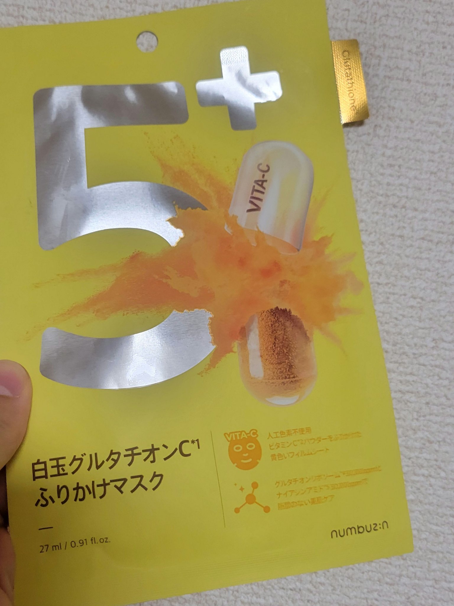 ♡numbuzin♡5番白玉グルタチオンCふりかけマスク1枚27ml黄色いシート!美容液は若干とろみのある透明😳美容液ひたひたでたっぷり水分補給される感じで気持ち良い😊翌朝つるんとした感じがして良かった✌️シートの大きさもちょうど良く刺激も特...