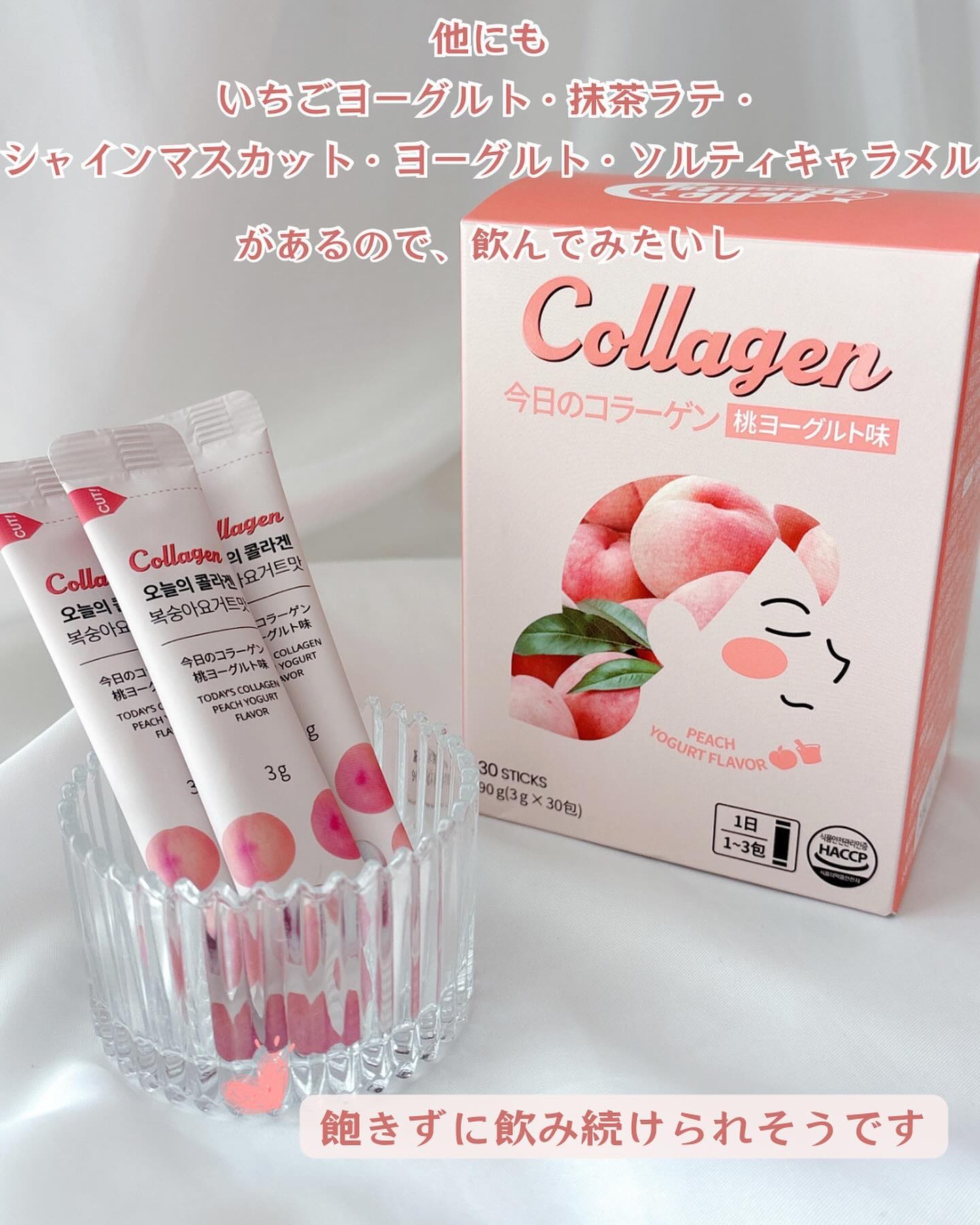 パッケージの可愛さに負けない、美味しさ👏🏻今日のコラーゲン韓国の可愛いパッケージのコラーゲン❤️可愛いだけかなと思ったら味も美味しいし、飲みやすくて、びっくり✨サラッとしたパウダータイプで口の中に入れるととろっとした飴のようになって甘くて美味しい😋👍🏻サッと水なし・スプーン無しで飲みやすいしデザートの代わりに、ご褒美感覚で飲み続けてます🙌🏻コラーゲンは独特の香りが苦手だったんですが気にならずに、飲めました✨桃ヨーグルト味は甘くて、桃の香りがして甘党さんにおすすめです😋🍑他にもいちごヨーグルト・抹茶ラテ・シャインマスカット・ヨーグルト・ソルティキャラメルがあるので、飲んでみたいし飽きずに飲み続けられそうです🌷#Qoo10メガ割