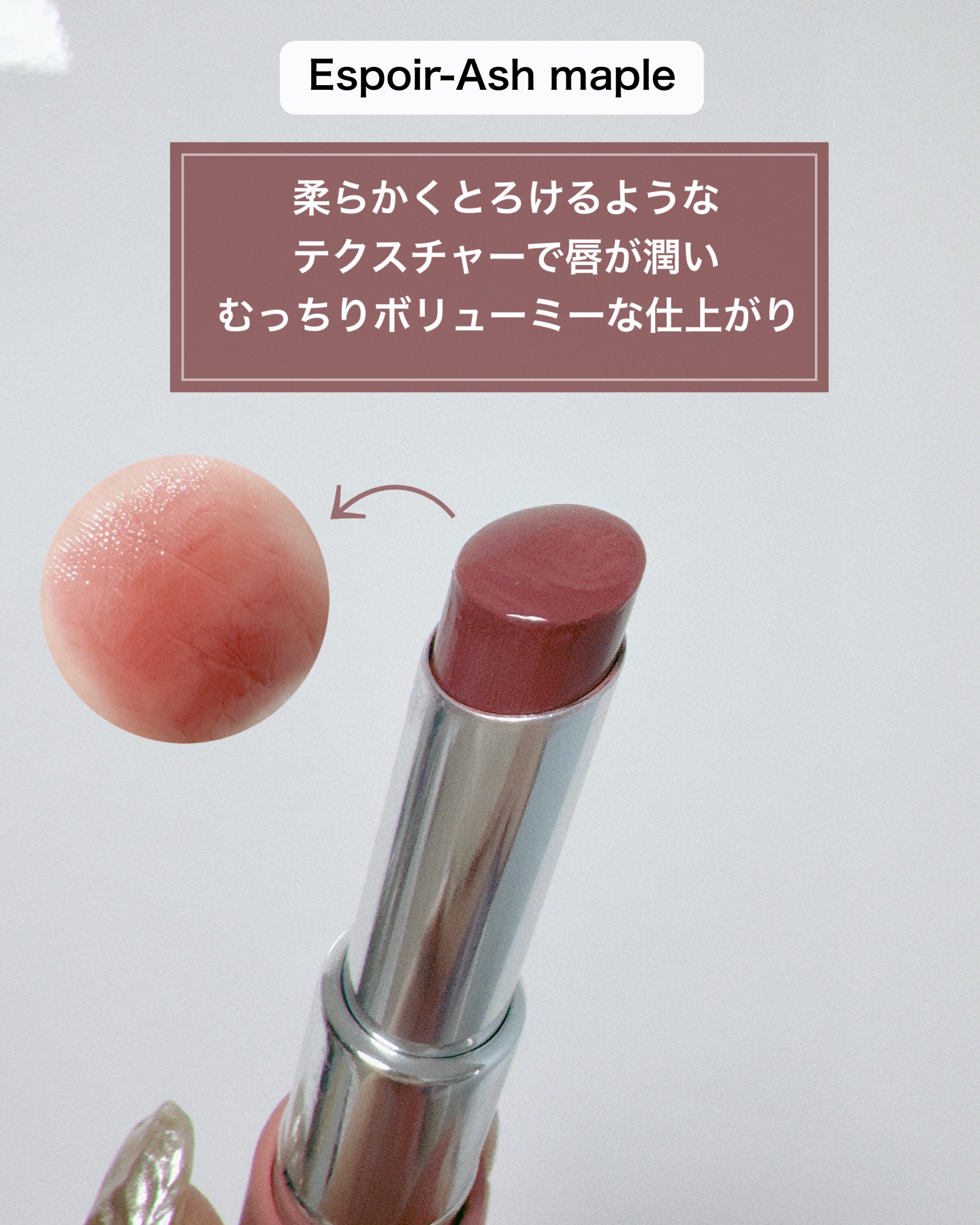 ツヤ系リップなのに 落ちにくいのがポイント! 発色も良くて柔らかなバームタイプだから 唇のしわに色落ちしないのも良い◎ 色を密着させながら 光沢だけ分離して 軽いジェル膜を形成してるんだって☽ 𓈒𓏸 私が使用したアッシュメープルは アッシュを混ぜた奥ゆかしく 血色のあるメイプルヌード.ᐟ.ᐟ.ᐟ 結構暗めにみえるんだけど すっごく肌なじみが良くて 大人肌にも浮かずに 血色良く見えるから嬉しい◝✩ 一度塗でも可愛いし もっと色をはっきり見せたい! ってときは二度塗りしてみると また印象が変わって良い感じ.˖٭* テクスチャーも柔らかくて 塗りやすいし伸ばしやすい! 細めのリップだから お直しも鏡無しでもしやすかった⸝⸝꙳