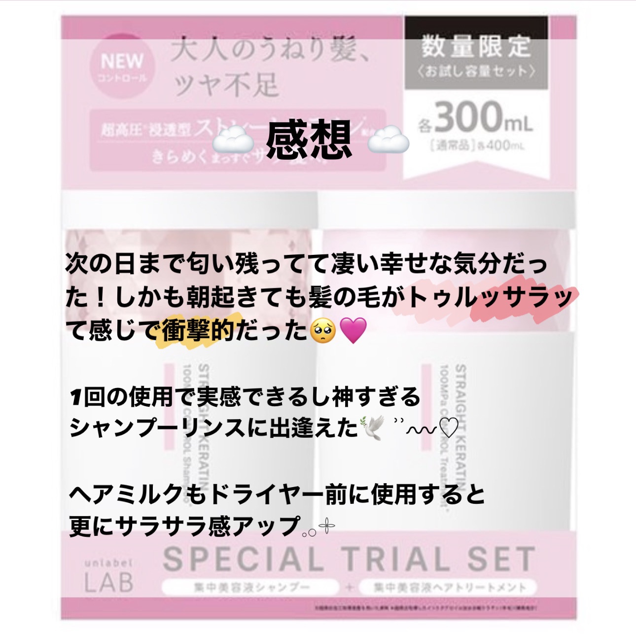 ────────────アンレーベルラボ KRコントロール シャンプー/トリートメント────────────超高圧浸透型ストレートケラチン配合なので、うねりやくせ、ツヤ不足の髪を集中補修🫧シャンプーは泡立ちがよく濃密泡で、頭皮や髪の汚れをすっきり落としてくれます。トリートメントは少しこっくりしたテクスチャーですが、髪によくなじみます。1週間程使用してみて、洗っている最中少し重たいかな?と思いましたが、ドライヤー後はさらさらしていてまとまってくれます♪寝起きはうねりなどなく、真っ直ぐストレートです。私の髪質は細く柔らかいので、絡まりやすいですが、シャンプー流す時も絡まりがほとんどないので、使い心地が良いです🙌ただ香りが少しキツく、翌朝でも香るので、サンプルでまず使ってみるのがいいかもしれません、、#unlabel