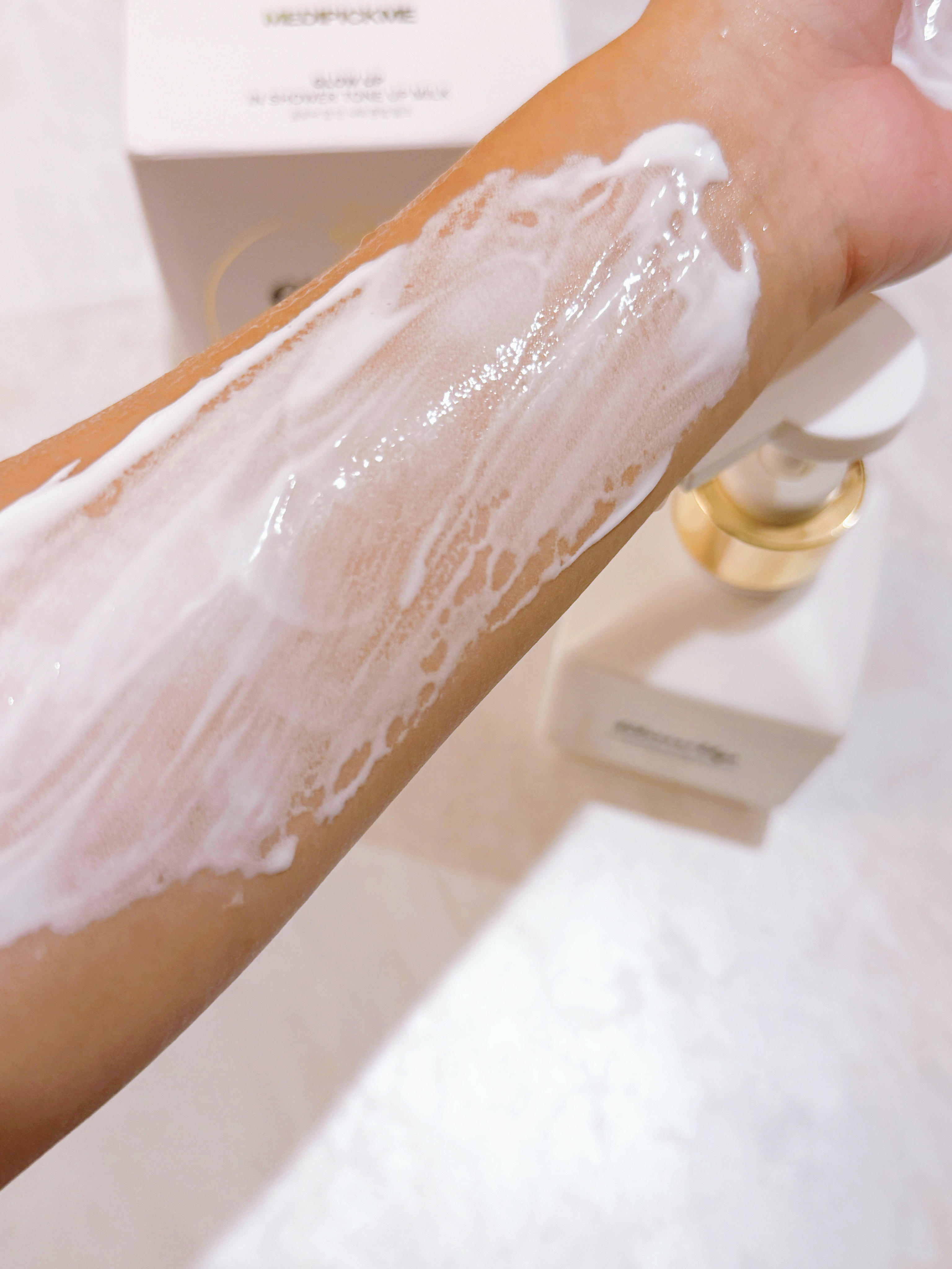 MEDIPICKMEグロウアップ イン シャワー トーンアップミルクを使用しました😊シャワーを浴びながら塗って洗い流すだけの全身用トーンアップミルクになっております✨従来のトーンアップミルクのお悩みを解決して、トーンアップ・保湿・パフュームを1本で叶えてくれます。皮膚刺激テスト済みでグローバル特許製法で作られた刺激性の低いお肌に優しい成分はボディからフェイスまで使用可能です。ヨーグルトのような伸びの良い柔らかいテクスチャーで肌にスッと伸びます。水気のある状態で塗って洗い流すだけでトーンアップしてくれます。さっぱりとした使用感でベタつかないのが良かったです。膝・肘・足首などの色素沈着やトーン悩み部位を改善してくれます。夏場や肌を露出することがある時に大活躍してくれるアイテムです。