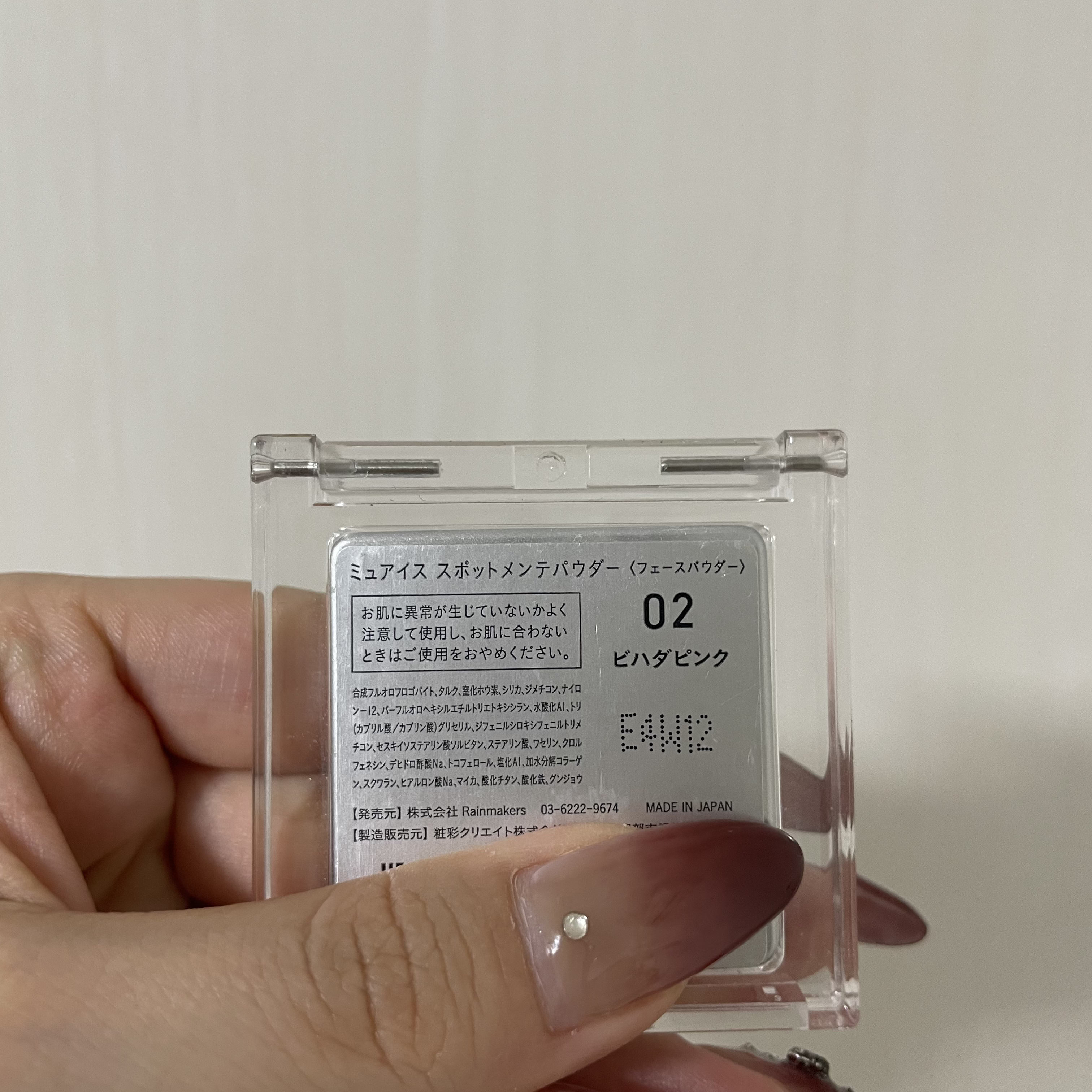 muiceスポットメンテパウダー02 ビハダピンク元祖BBA粉✨ずっと気になってたけどやっぱりよかった!!マットよりだけど少しだけ光沢があるので鼻筋に入れると最高によい😭小鼻とかにもいいみたいだけど持ちは微妙かな、、でも持ち運びやすいし粉川取りやすい形状だしかなりおすすめです🥰