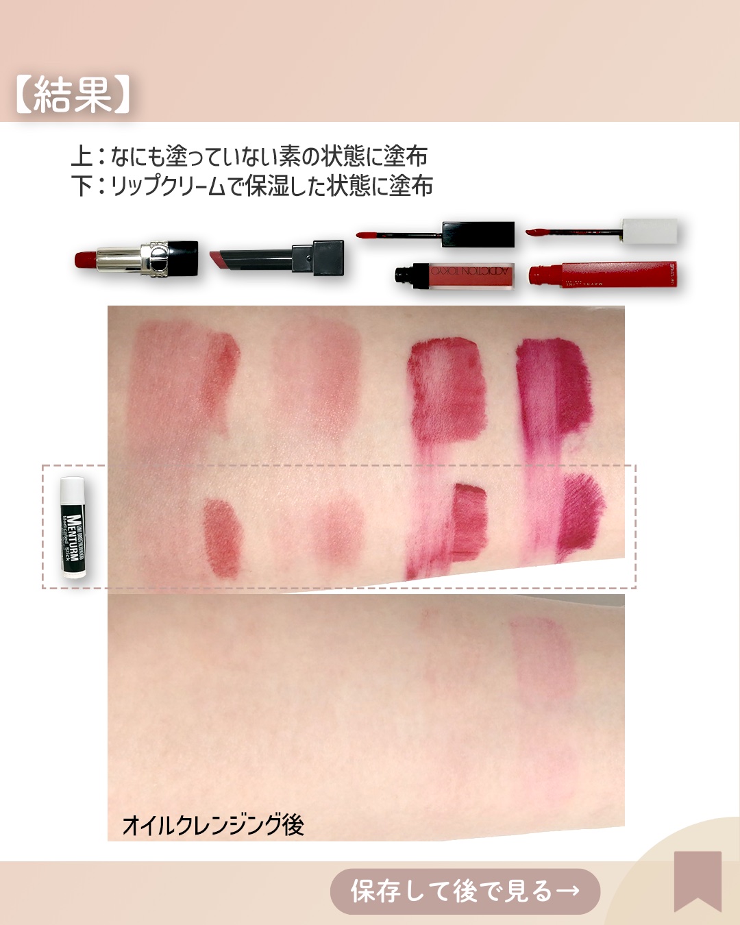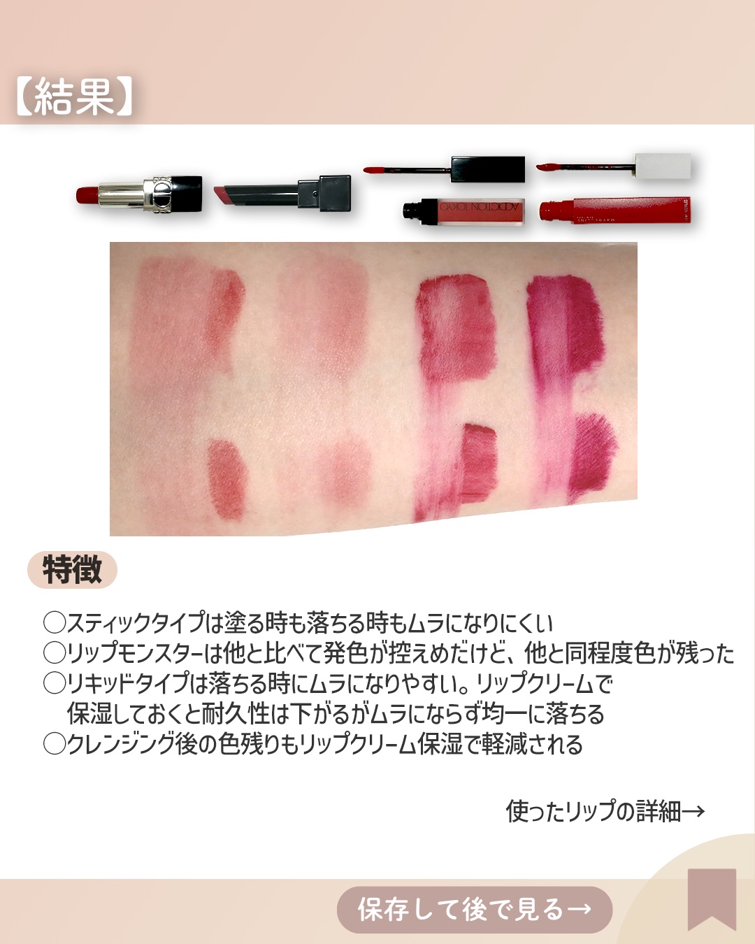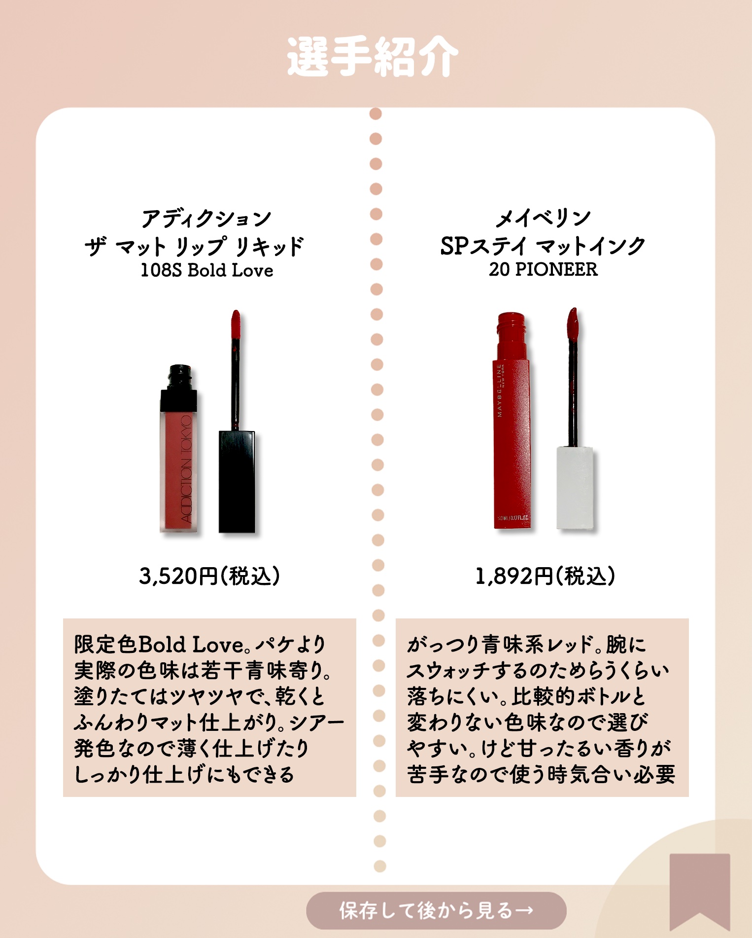 赤リップ耐久比較!選手紹介💪#ディオール☑︎ルージュディオール #ケイト☑︎リップモンスター#アディクション ☑︎ザマットリップリキッド#メイベリン ☑︎SPステイマットインク 思った以上にリプモンが控えめレッドで比較してもいいものか迷いましたが見てもらえたら嬉しいです!検証結果と使い方のコツ、それぞれの使用感もまとめました個人的にはディオールやアディクションがこんなにも色持ちよかったのかと驚きました!水だけでじわっと浮いてきちゃうものかと思っていたので意外な結果です💪検証はこんな結果でしたが、やっぱり飲食したあとにも残っているのはケイトのリプモンとメイベリンです。そして落ち方が綺麗で香りもないリプモンがやっぱり強いです😂よかったらお買い物の参考にしてください♡インスタもよろしくお願いします!Instagram▷▷ @pomi_cosme_#リップ #耐久比較 #耐水 #比較 #こすれ #検証 #リップメイク #コスメ #飲み会リップ #落ちないリップ #落ちない #プチプラ #デパコス #DIOR #dior #KATE #kate #ADDICTION #addiction #MAYBELLINE #maybelline