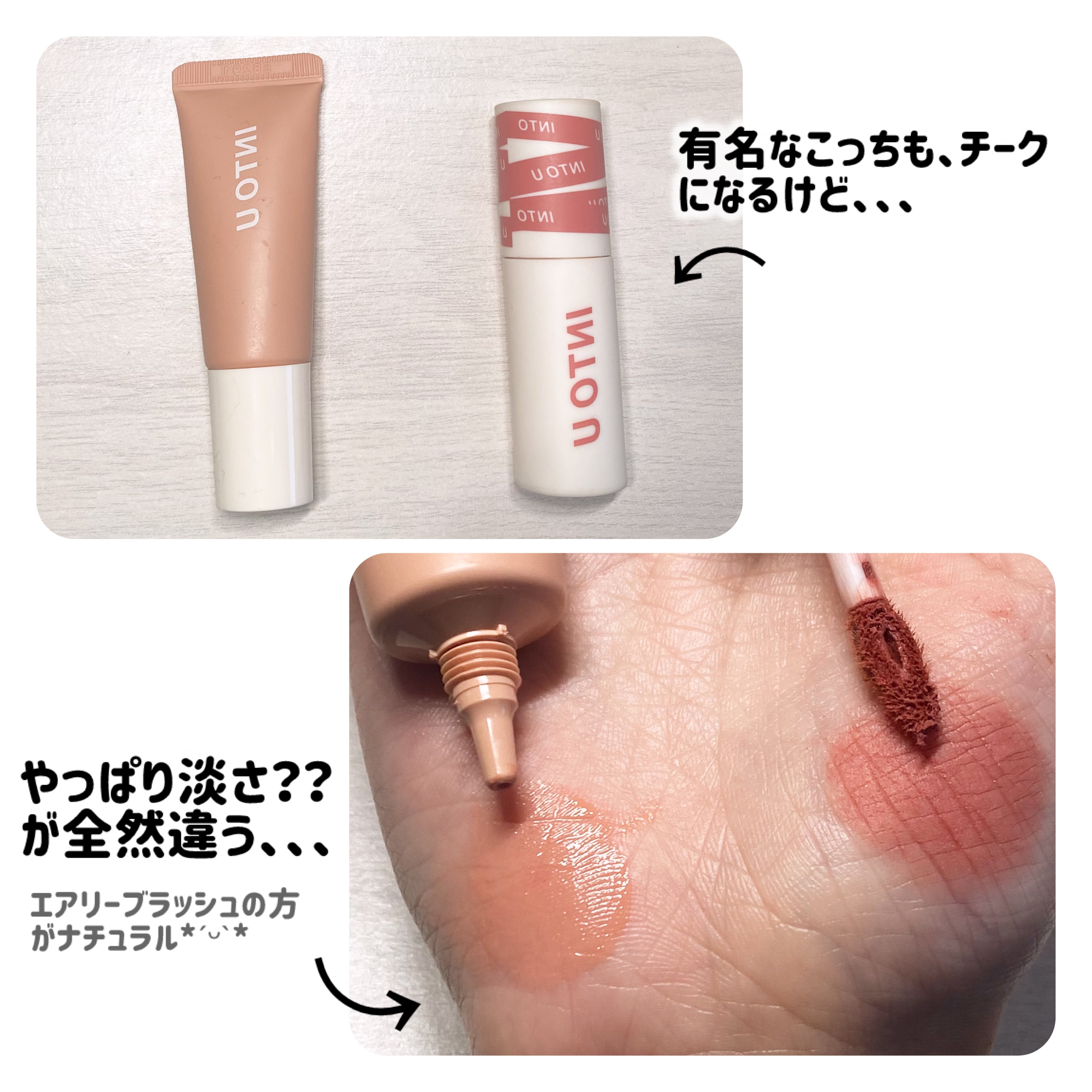 INTOUエアリーブラッシュA05マンゴーソルベ💫ふんわり発色のリキッドタイプ?のチーク🤍🫧INTOUのものって全部色味可愛いし質感もだいすき🥹公式の写真通りの色味でした!混合肌で粉のチークだと頬が乾燥して粉ふいてしまうのですが、リキッドタイプのチークだと粉を重ねなくて良くなるので乾燥が気にならなりました🫣パケもほんとにかわいすぎてテンション上がる😮💨これは全色揃えたくなる❕❕